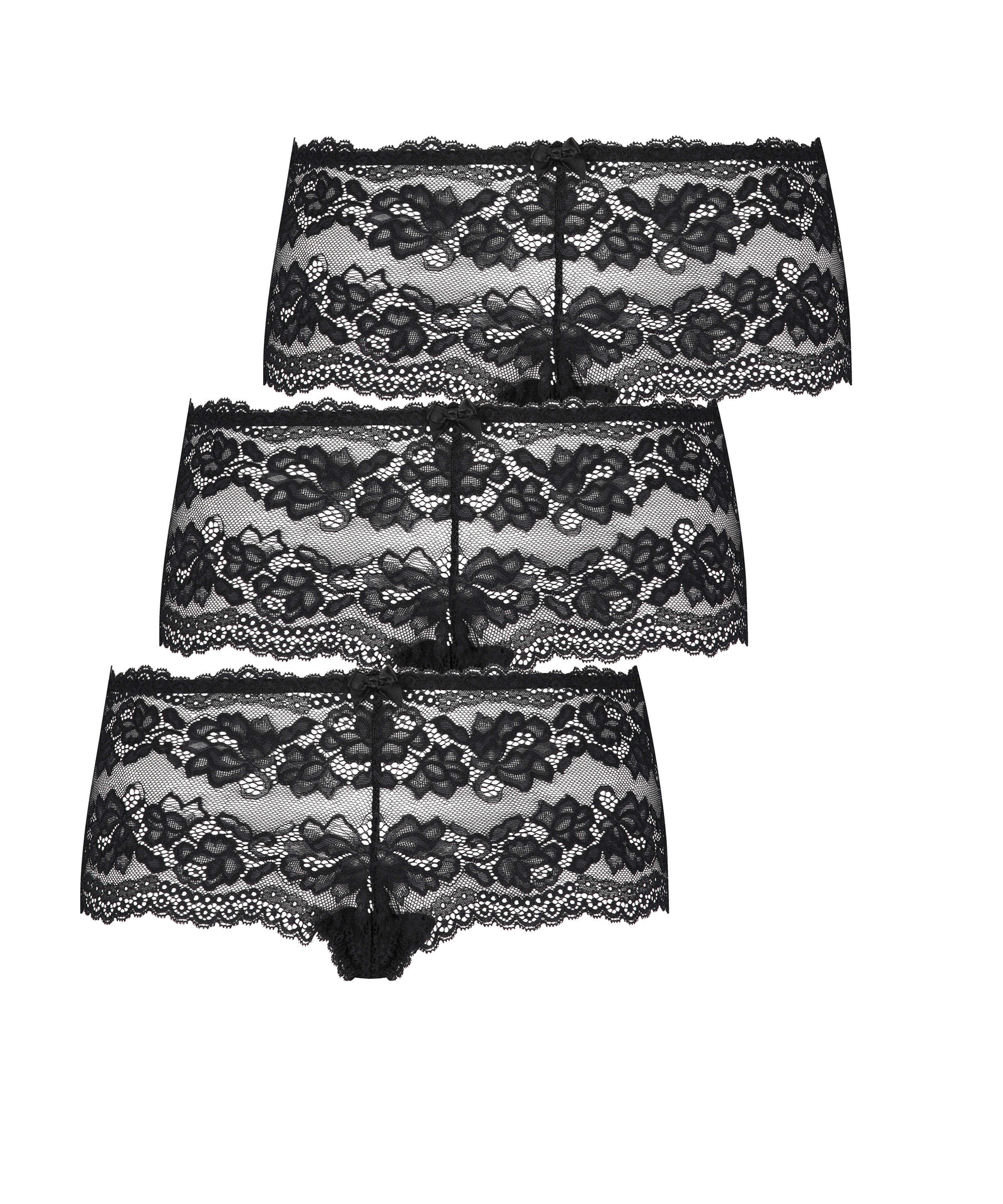 Poczuj się seksownie w tych bokserkach! Majtki mają wykończenie z koronki i małą kokardkę. 3 pary w poręcznym opakowaniu! Połącz z dopasowanym biustonoszem.