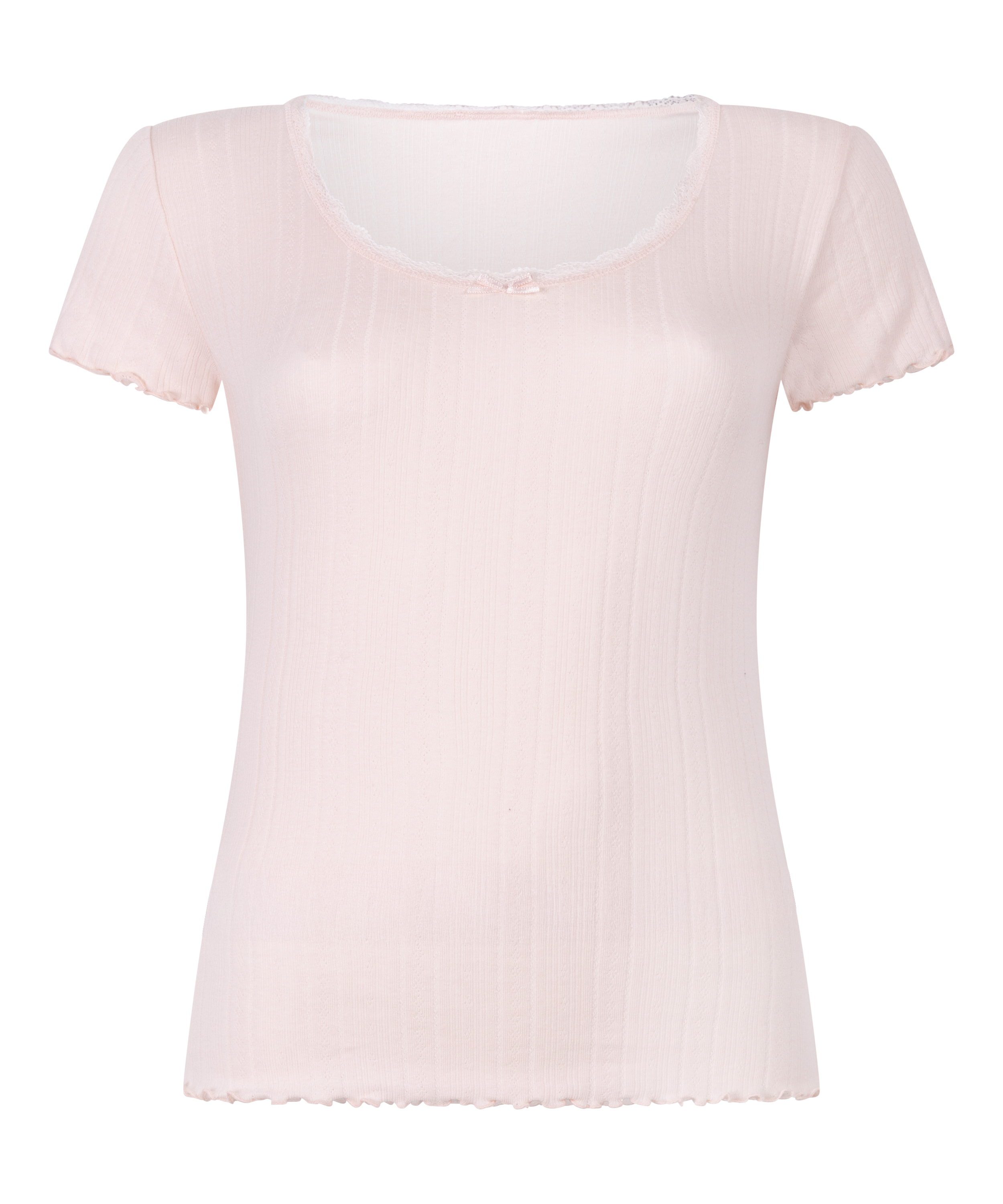 Dodaj odrobinę romantyzmu do swojej odzieży nocnej! Miękka tkanina pointelle i krótkie rękawy zapewniają lekkość i wygodę, podczas gdy koronkowe wykończenia, delikatna kokardka i delikatne falbanki dodają każdemu detalowi radosnego uroku.