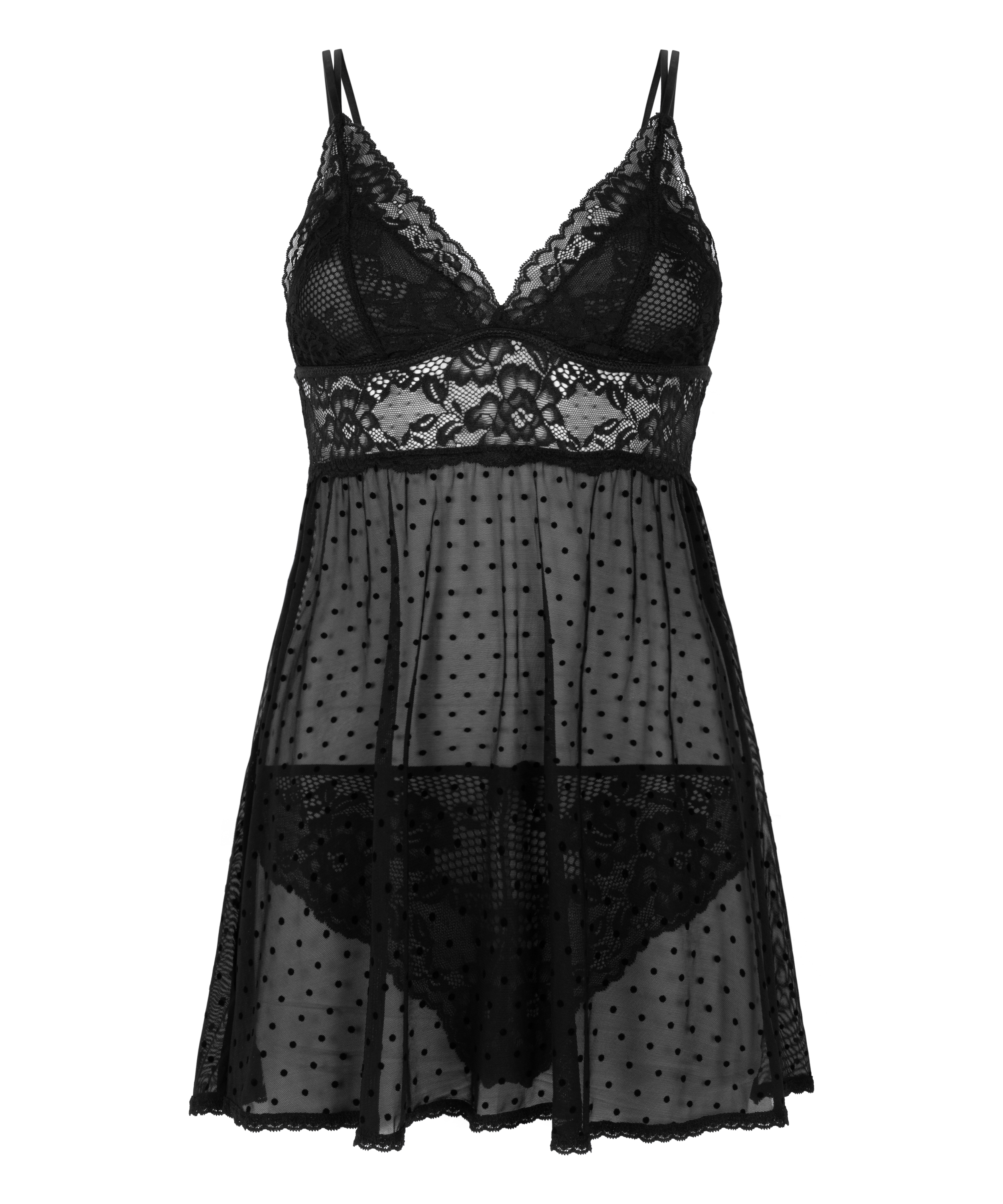Poczuj się seksownie w tej nieusztywnianej sukience babydoll! Sukienka ma koronkowe i siateczkowe detale, regulowane ramiączka i wzór w kropki. Dopasowane figi wykonane są z mieszanki koronki i siateczki.