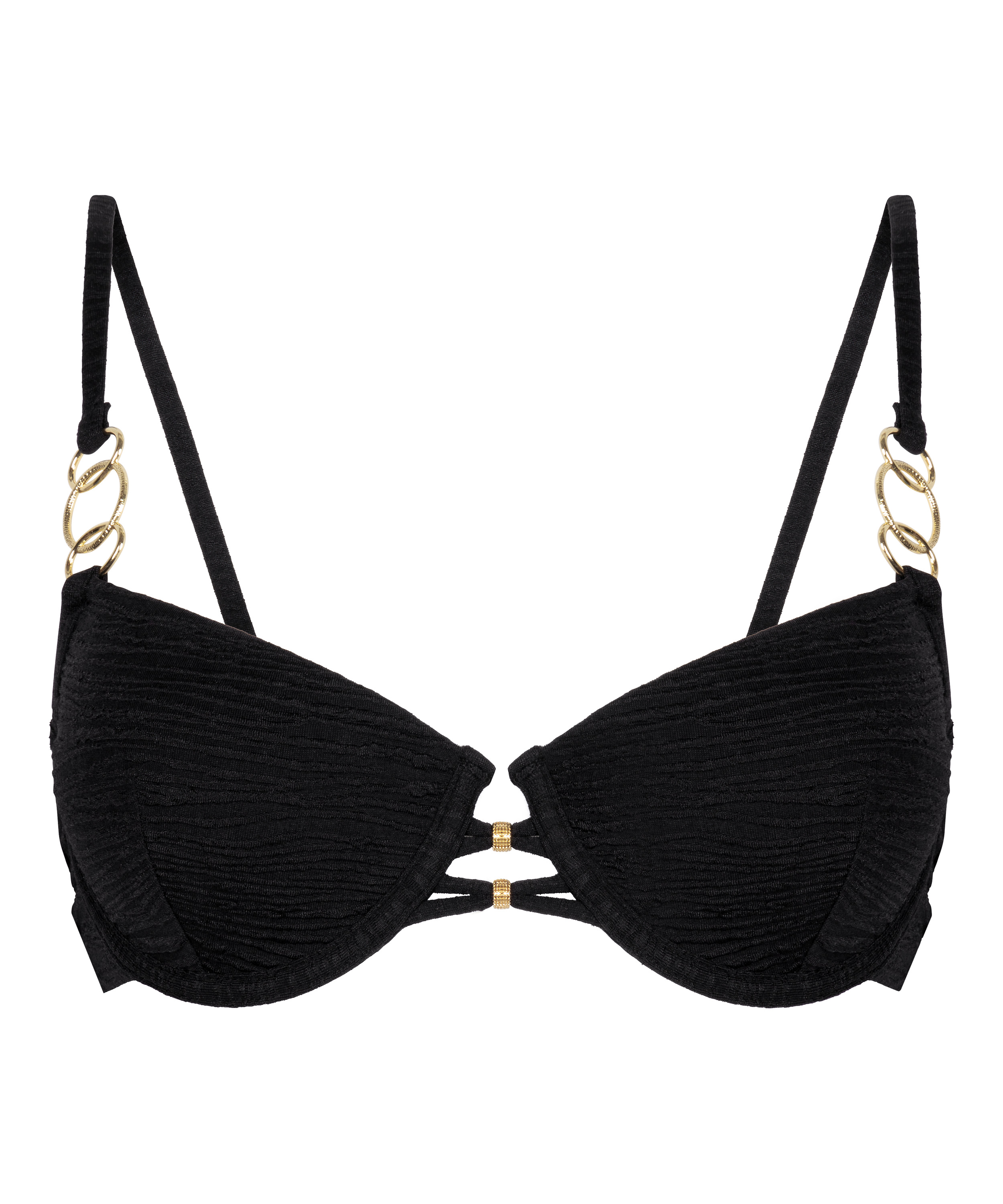 Postaw na plażowy glamour! Czarny, usztywniany biustonosz bikini zapewni Ci odważne wsparcie i złoty blask. Eleganckie miseczki, które modelują i unoszą biust, a także luksusowe złote kółka, które dodają natychmiast blasku, sprawiają, że ten biustonosz jest stworzony dla osób, które skąpane w słońcu czują się pewnie. Nieważne, czy odpoczywasz, czy nurkujesz, ten top jest idealny dla Ciebie!