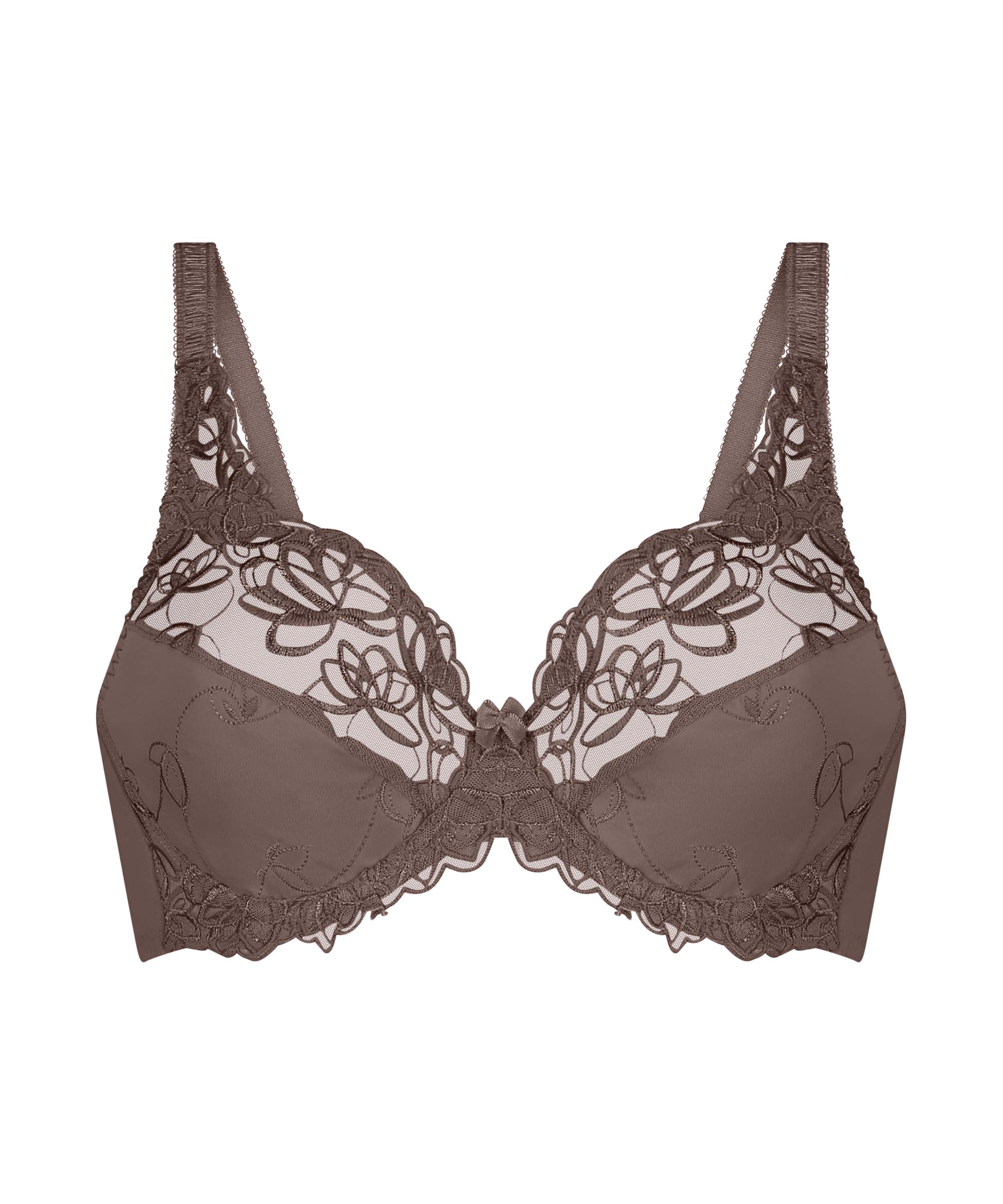 Nieusztywniany biustonosz z fiszbinami, wykonany z nieprześwitującej tkaniny z półprzezroczystą koronką u góry. Miseczki ozdobione są kwiatowym wzorem. W połączeniu z pasującymi figami Diva, otrzymasz kompletny zestaw bielizny.