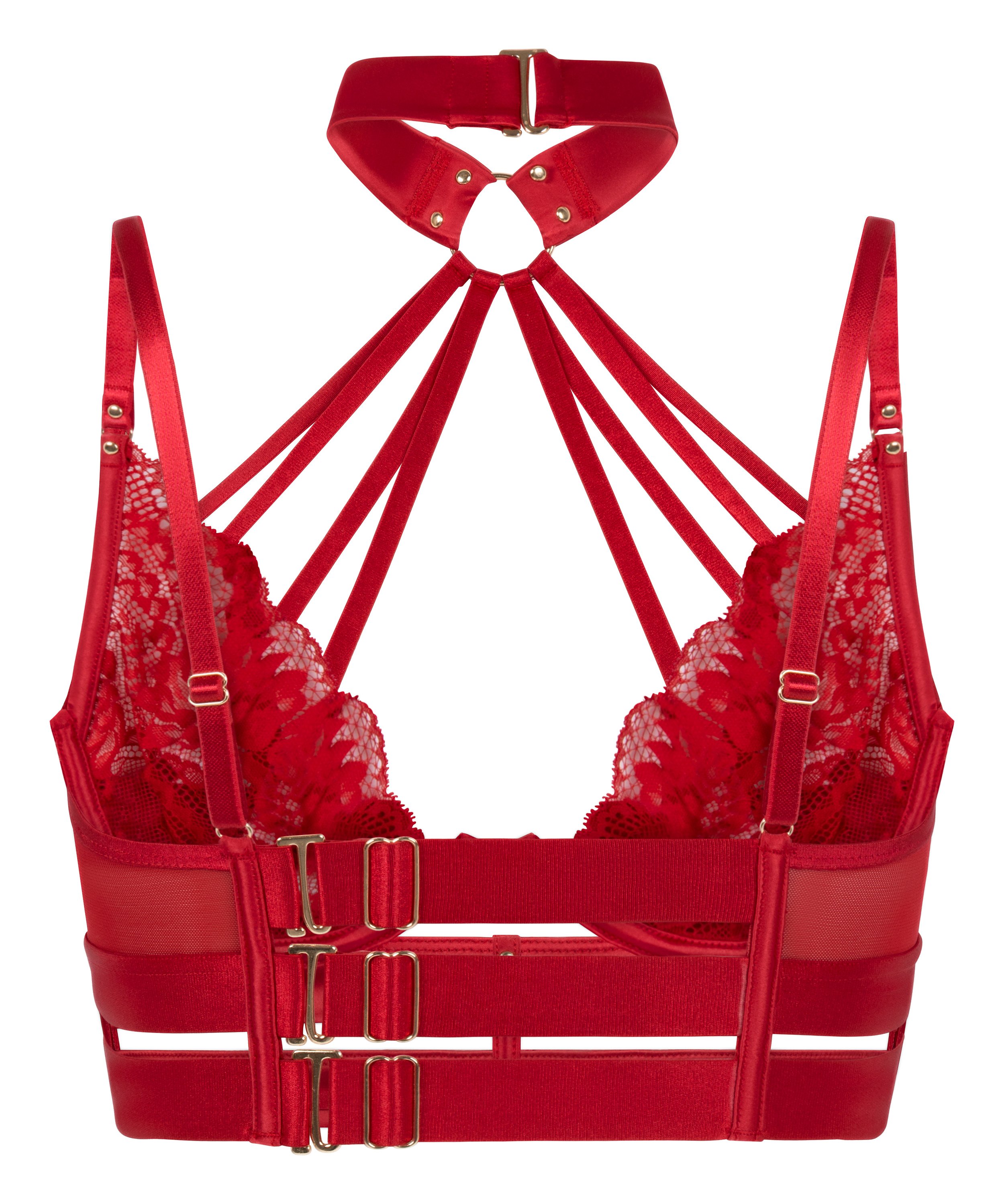 Podnieś poziom swojej bieliźniarki dzięki temu usztywnianemu, długiemu biustonoszowi bez wypełnienia, stworzonym dla maksymalnego podparcia i stylu. Wykonany z jedwabistej satyny i delikatnej koronki, ma elegancki choker na szyję typu halter oraz gładki pas pod biustem, który podkreśla odważną, kobiecą sylwetkę. Złote pierścienie nadają temu wyjątkowemu modelowi luksusowego charakteru. Idealny dla miłośniczek premium bielizny z odważnym akcentem. Połącz go z dopasowanymi brazylianami i pasem do pończoch, aby stworzyć kompletny look.