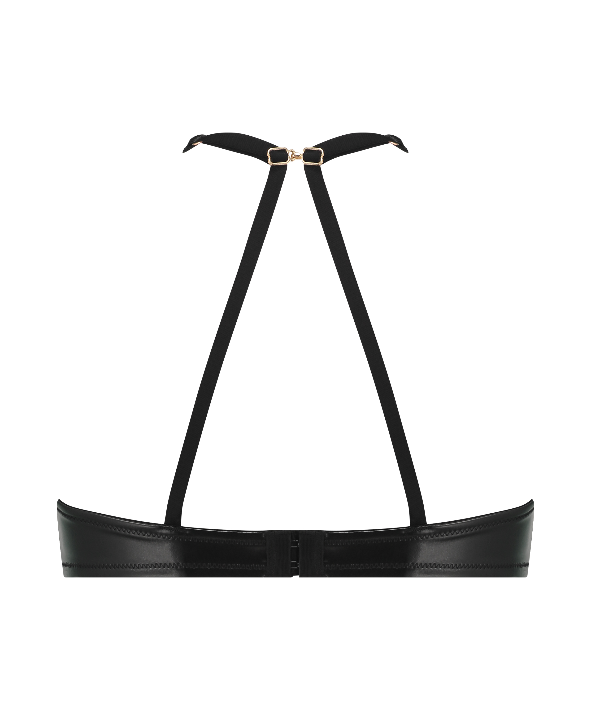 Ta biustonosz charakteryzuje się eleganckim designem z czarnej skóry ekologicznej z delikatnymi złotymi detalami. Dekolt w kształcie litery V dodaje odważnego akcentu, a regulowane ramiączka zapewniają dopasowanie do sylwetki. Miseczki z fiszbinami zapewniają wsparcie i kształt. Biustonosz został zaprojektowany tak, aby podkreślać figurę i dodawać jej elegancji