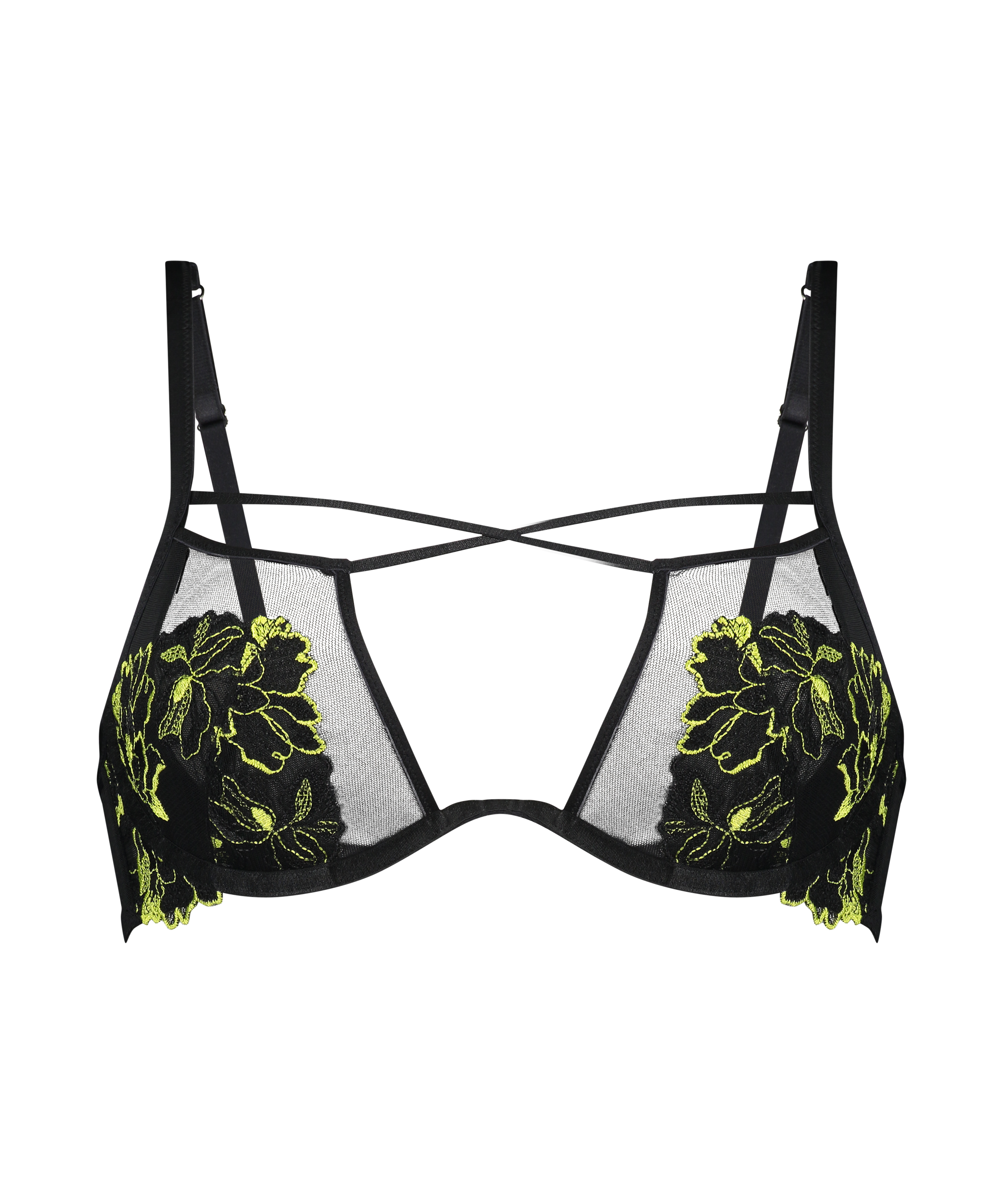 Wybierz seksowny i ekscytujący komplet bielizny z tym biustonoszem z półprzezroczystą koronką i detalami na ramiączkach.
