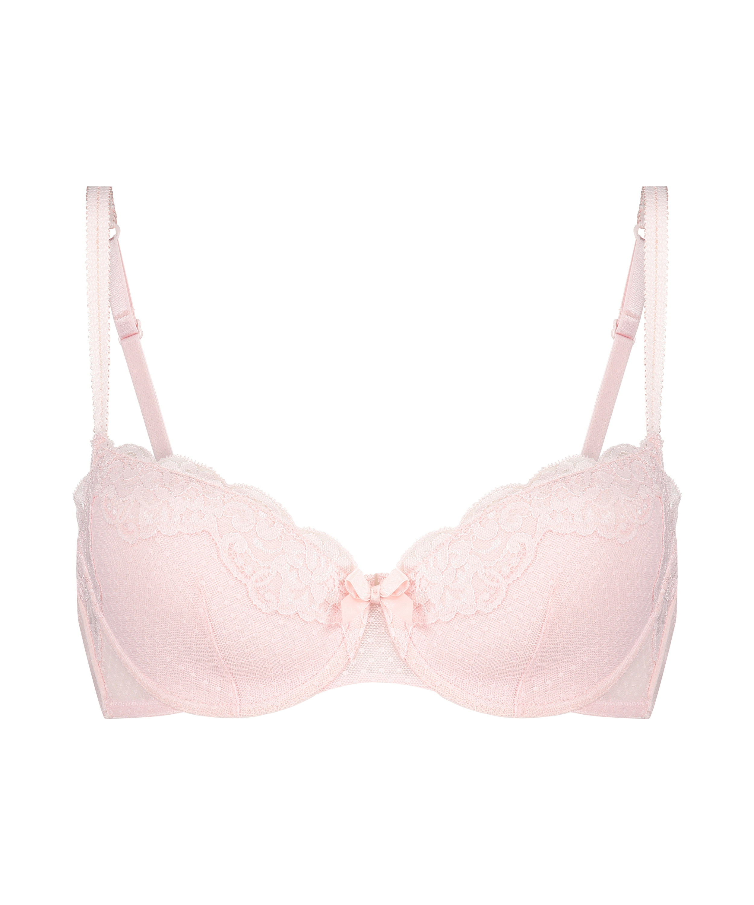 Ten usztywniany biustonosz z fiszbinami wykończony jest koronką i siateczką na miseczkach. Siateczka ma tkany wzór w kropki. Ozdobiony małą kokardką między miseczkami! Połącz ten biustonosz z pasującymi majtkami, aby uzyskać kompletny zestaw.