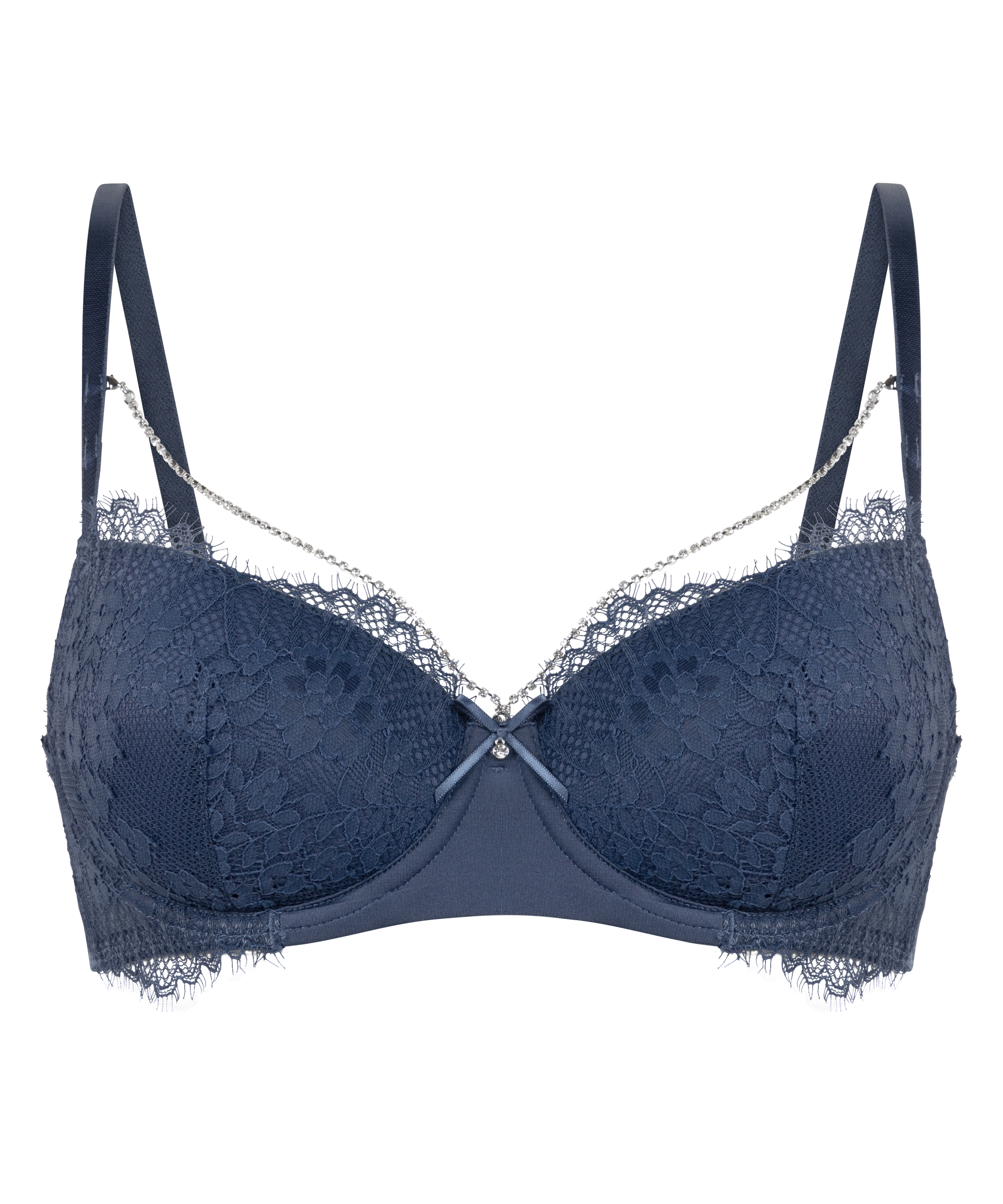 Poczuj się seksownie w naszym biustonoszu z fiszbinami! Oferuje mnóstwo koronkowych detali i uroczą kokardkę między miseczkami. W zestawie znajduje się odpinany naszyjnik. Znajdź pasujące figi i stwórz komplet, który zachwyci!
