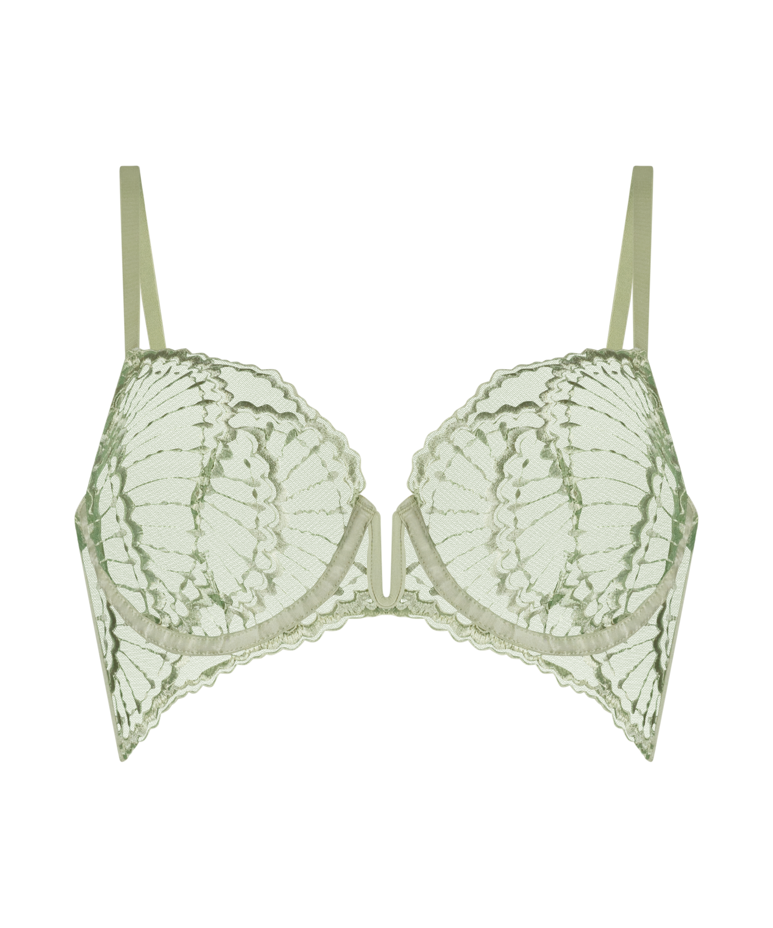 Olśniewaj w tym luksusowym i eleganckim biustonoszu! Wykonany z delikatnej siateczki misternie haftowanej w motywy kwiatowe, nieusztywniany biustonosz emanuje ponadczasowym urokiem. Posiada zapięcie na haczyk z tyłu i regulowane ramiączka umożliwiające indywidualne dopasowanie. Połącz z dopasowanym dołem, aby dopełnić stylizację!