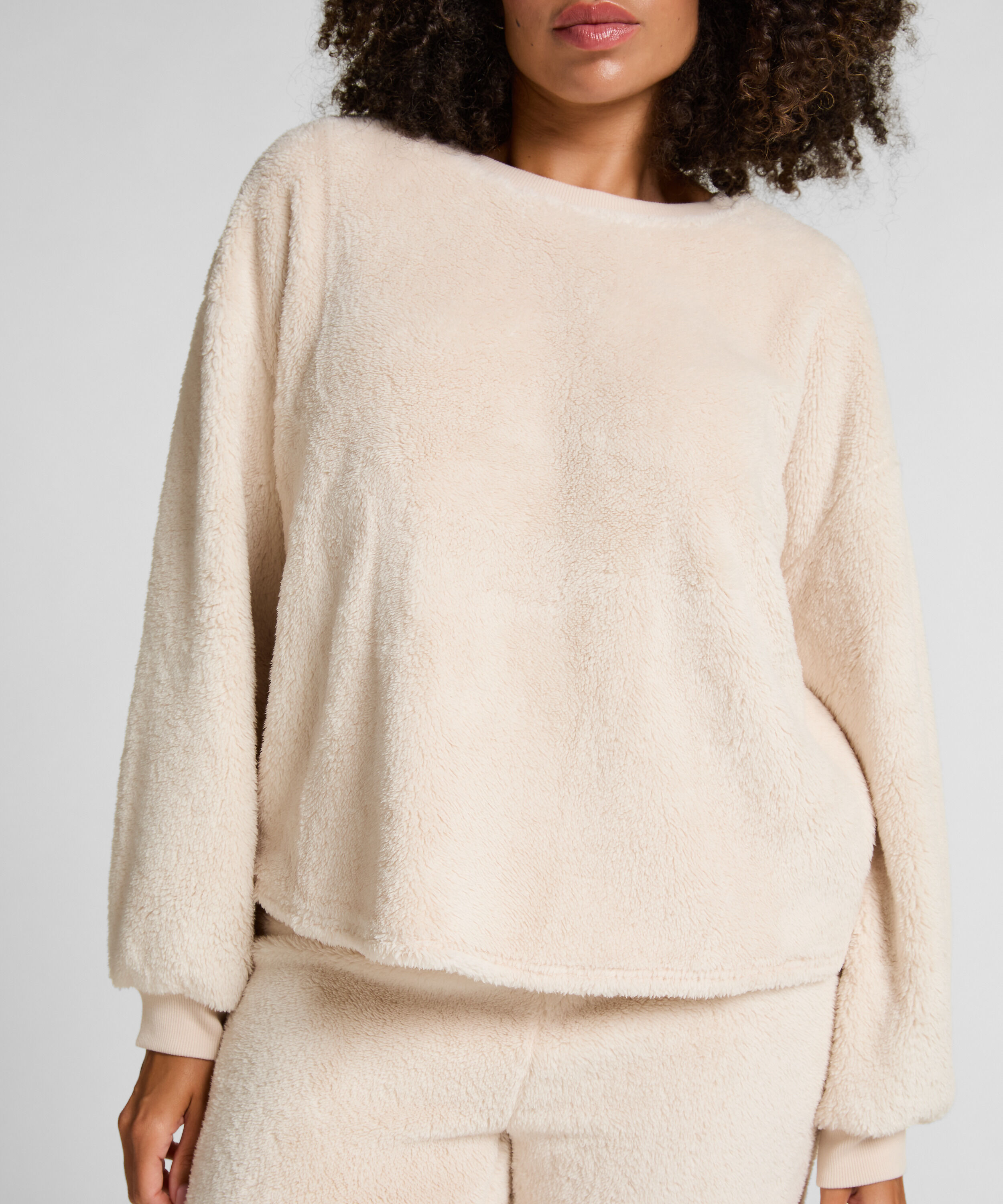 Otul się ciepłem dzięki naszej bluzie z miękkiego polaru – to wyjątkowo wygodny element garderoby o miękkim, stylowym charakterze. Ten sweter wykonany z miękkiego polaru zapewni ci ciepło i sprawi, że będziesz wyglądać przytulnie. Luźny krój z długimi, szerokimi rękawami i klasycznym okrągłym dekoltem sprawia, że bluza idealnie nadaje się do leniuchowania. Połącz z dopasowanymi spodniami od piżamy, aby stworzyć komplet.