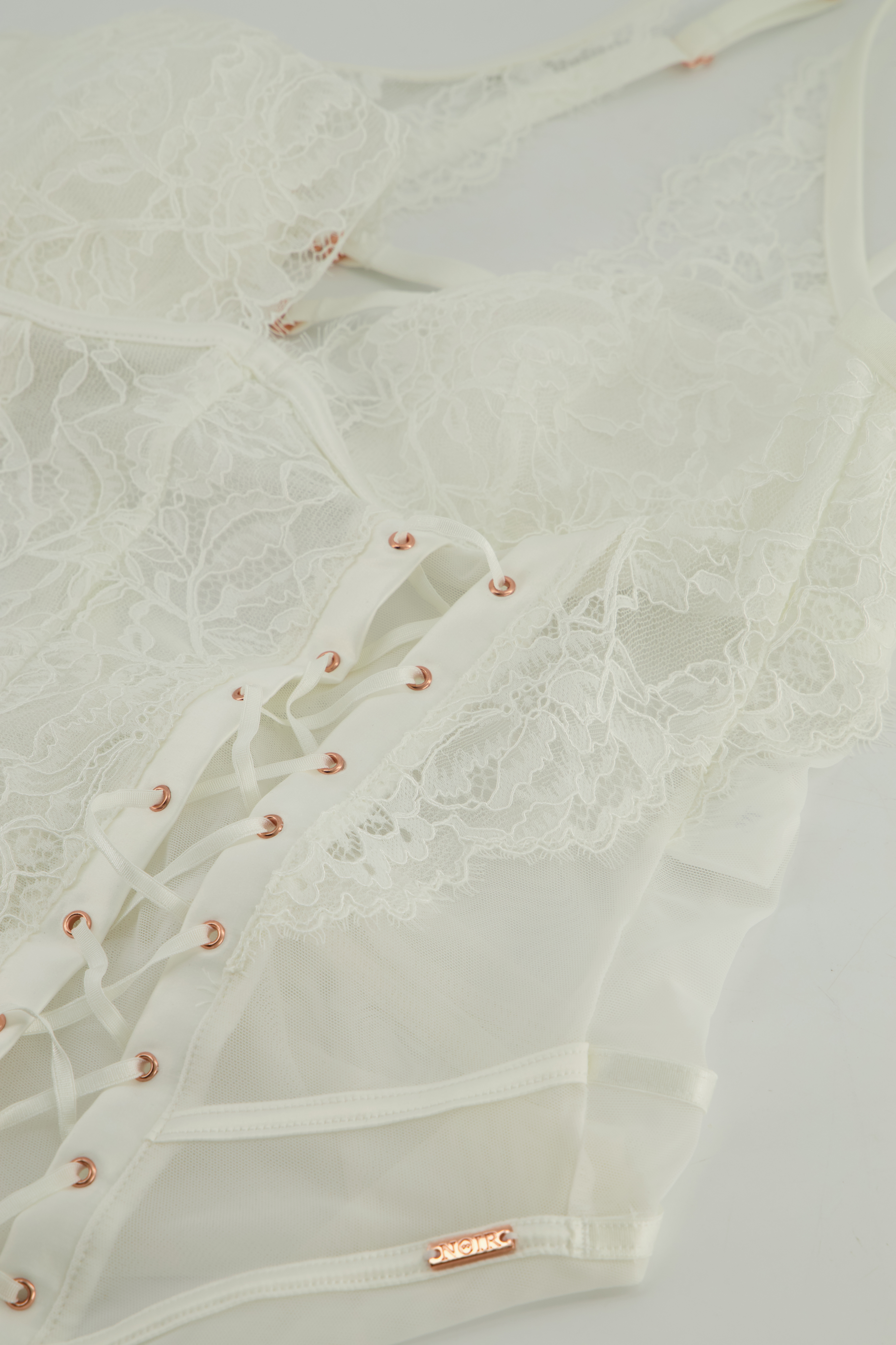 Poczuj się wyjatkowo elegancko i szykownie dzięki temu body! Z dużą ilością romantycznych koronek i przezroczystym materiałem, zapewniającym półtransparentny wygląd. Dużo szykownych paseczków z przodu. Połącz je z kimono!