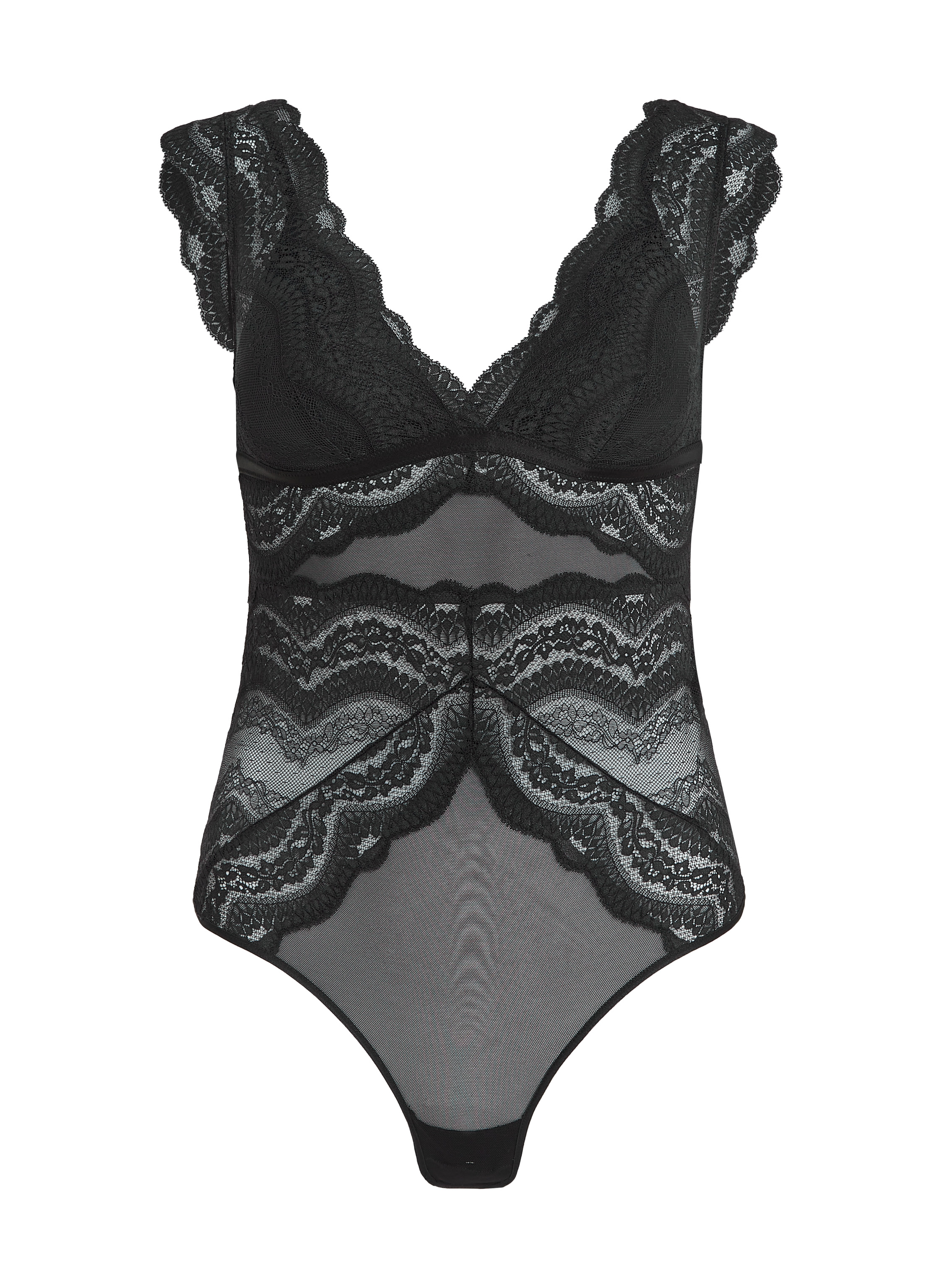 Przyciągnij spojrzenia tym pięknym body, olśniewającym elementem pełnym elegancji. Przód zdobią koronkowe detale, podczas gdy tył z siateczki zapewnia smukły i korzystny fason. Wycięcie na plecach dodaje odważnego akcentu, czyniąc to body doskonałym.
