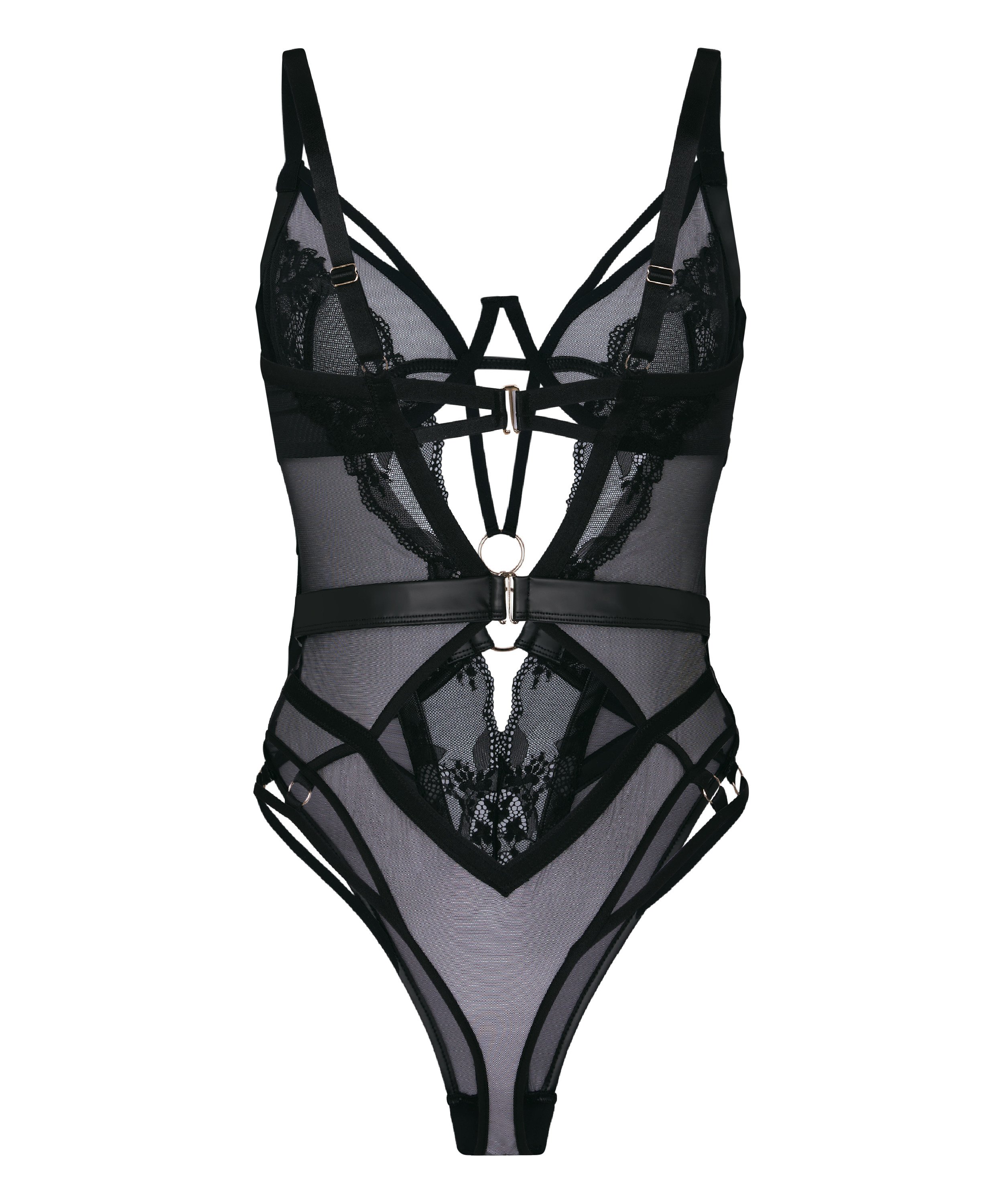 Efektowne body zaprojektowane z fiszbinami dla wspierającego kształtowania i struktury. Przezroczyste panele z siateczki łączą się z koronką i gładkimi wykończeniami, tworząc uderzający warstwowy wygląd. Ozdobne detale ramiączek z przodu i z tyłu dodają odważnego, rzeźbiarskiego efektu. Regulowane ramiączka pozwalają na dopasowanie do sylwetki. Wykończone zapięciem na napy w kroku dla praktycznego noszenia.