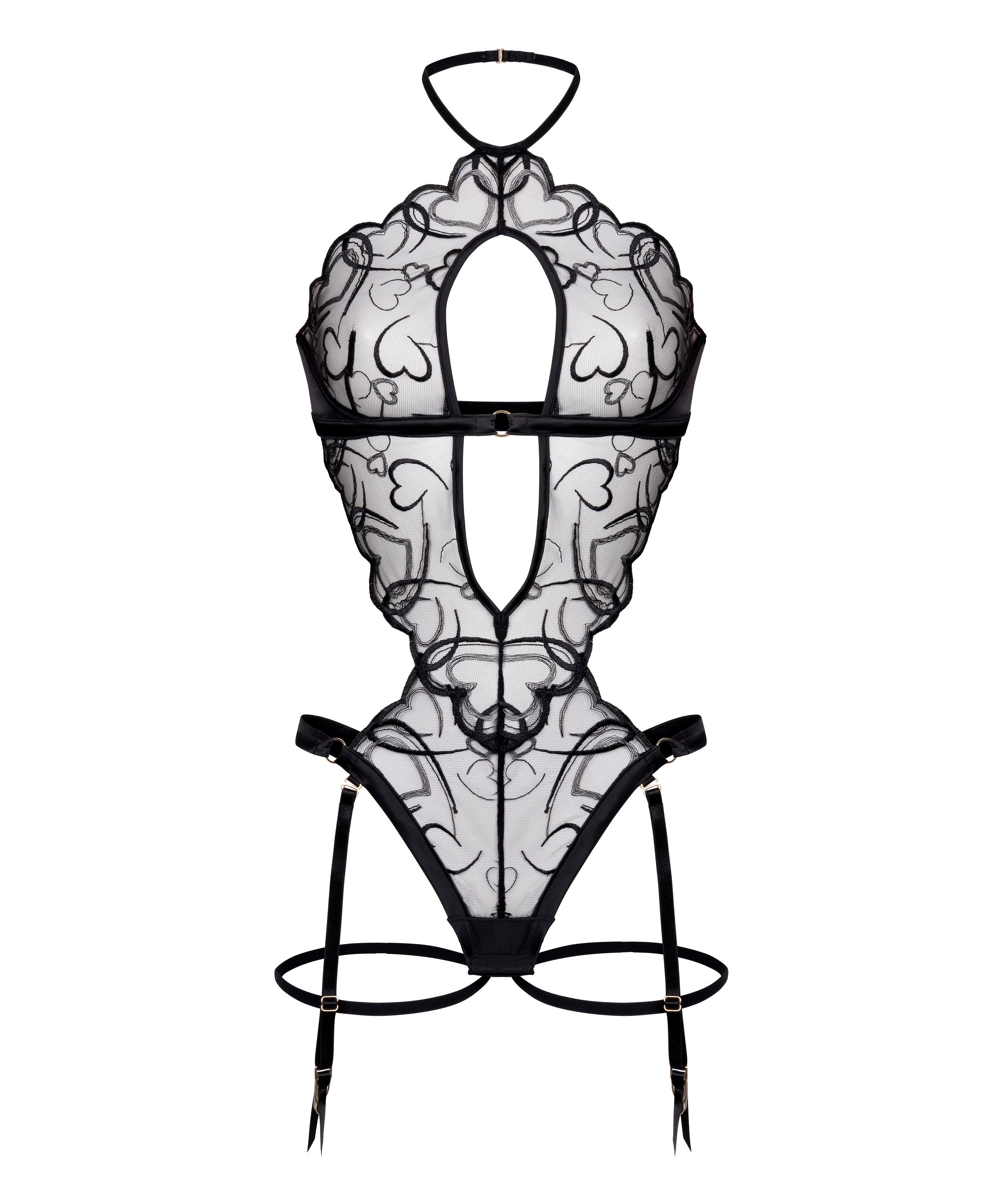 Bądź w centrum uwagi dzięki temu efektownemu body z naszej ekskluzywnej kolekcji Private. Zaprojektowany, aby urzekać, model ten charakteryzuje się odważnymi wycięciami i prowokującymi akcentami na paskach, które modelują oraz podkreślają sylwetkę. Wykonana ze zmysłowego połączenia prześwitującej siateczki i delikatnej koronki, ta część garderoby łączy w sobie odważne wzornictwo i wyrafinowaną elegancję.