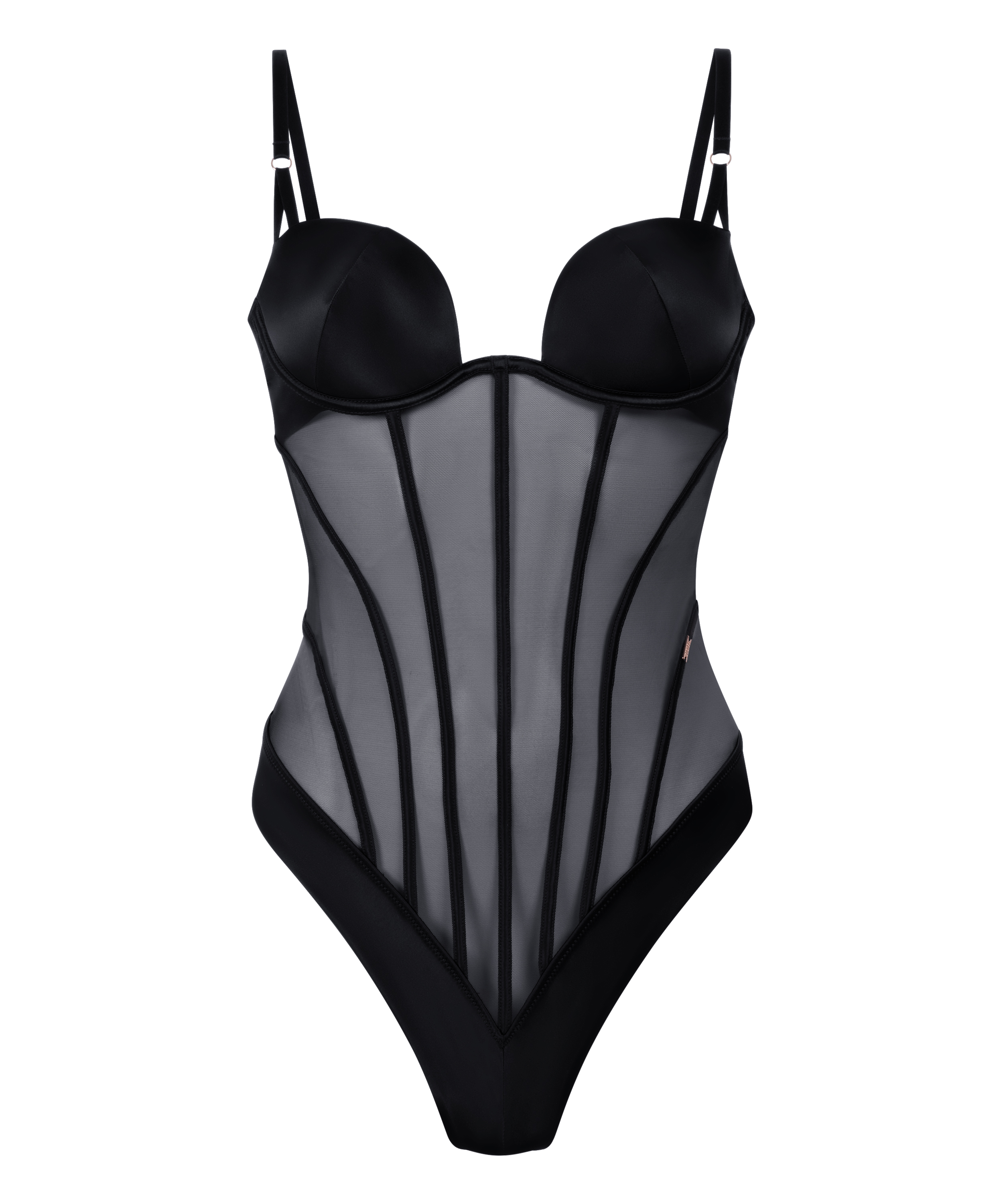 Rozkoszuj się luksusowym komfortem z naszym body Paige. Satynowe miseczki mają gładkie, błyszczące wykończenie, zapewniając atrakcyjną, miękką w dotyku powierzchnię, natomiast siateczkowe wstawki tworzą odważny kontrast, który podkreśla Twoje kształty.