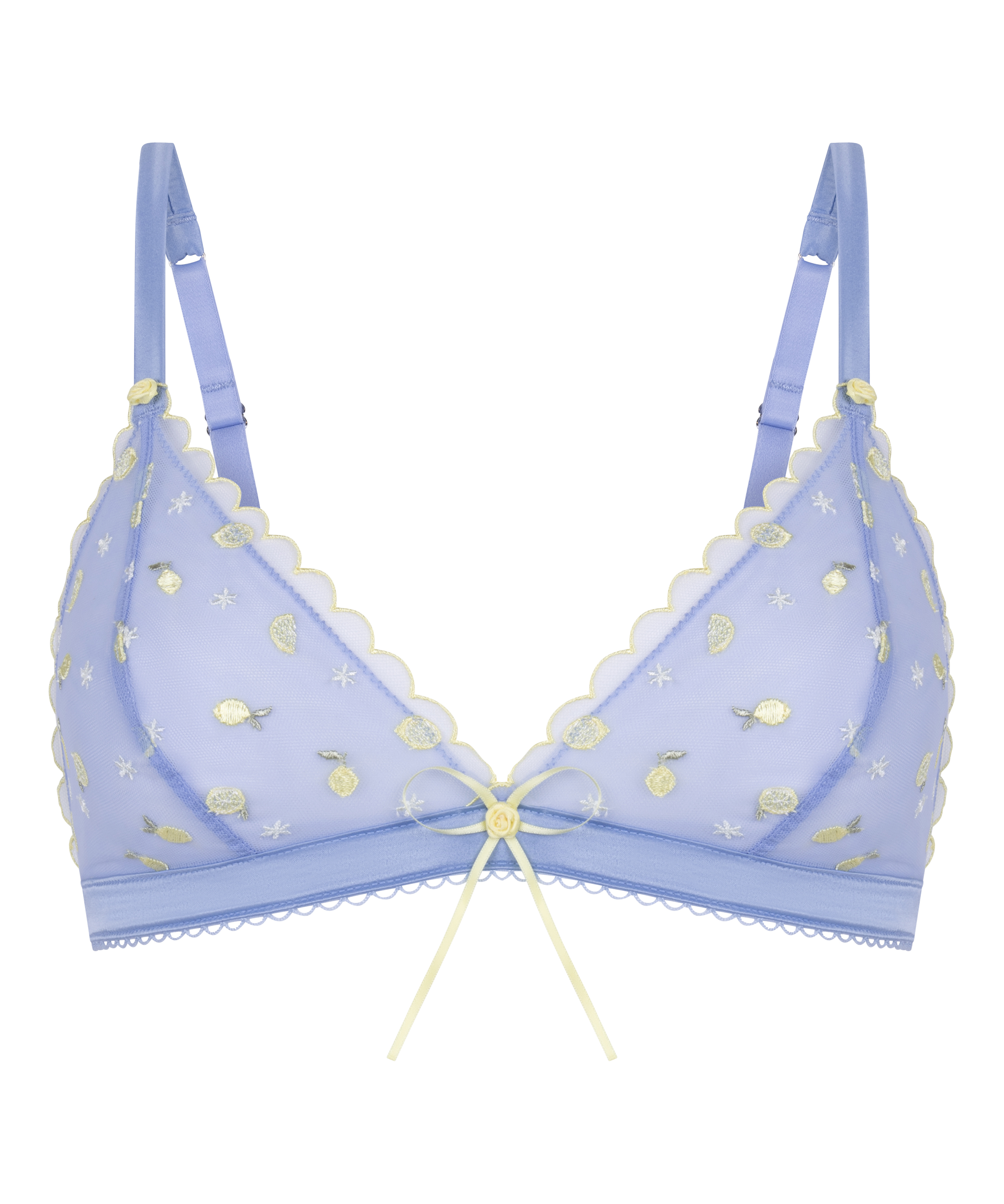 Delikatny trójkątny bralette wykonany z przezroczystej koronki z pięknymi haftowanymi detalami. Miękkie, niewypełnione miseczki tworzą naturalny, lekki kształt. Ozdobne wykończenia picot i mała kokardka pośrodku dodają romantycznego akcentu. Regulowane ramiączka zapewniają wygodne, elastyczne dopasowanie. Kobiecy element codziennej garderoby, który jest równie piękny w dotyku, jak i w wyglądzie.