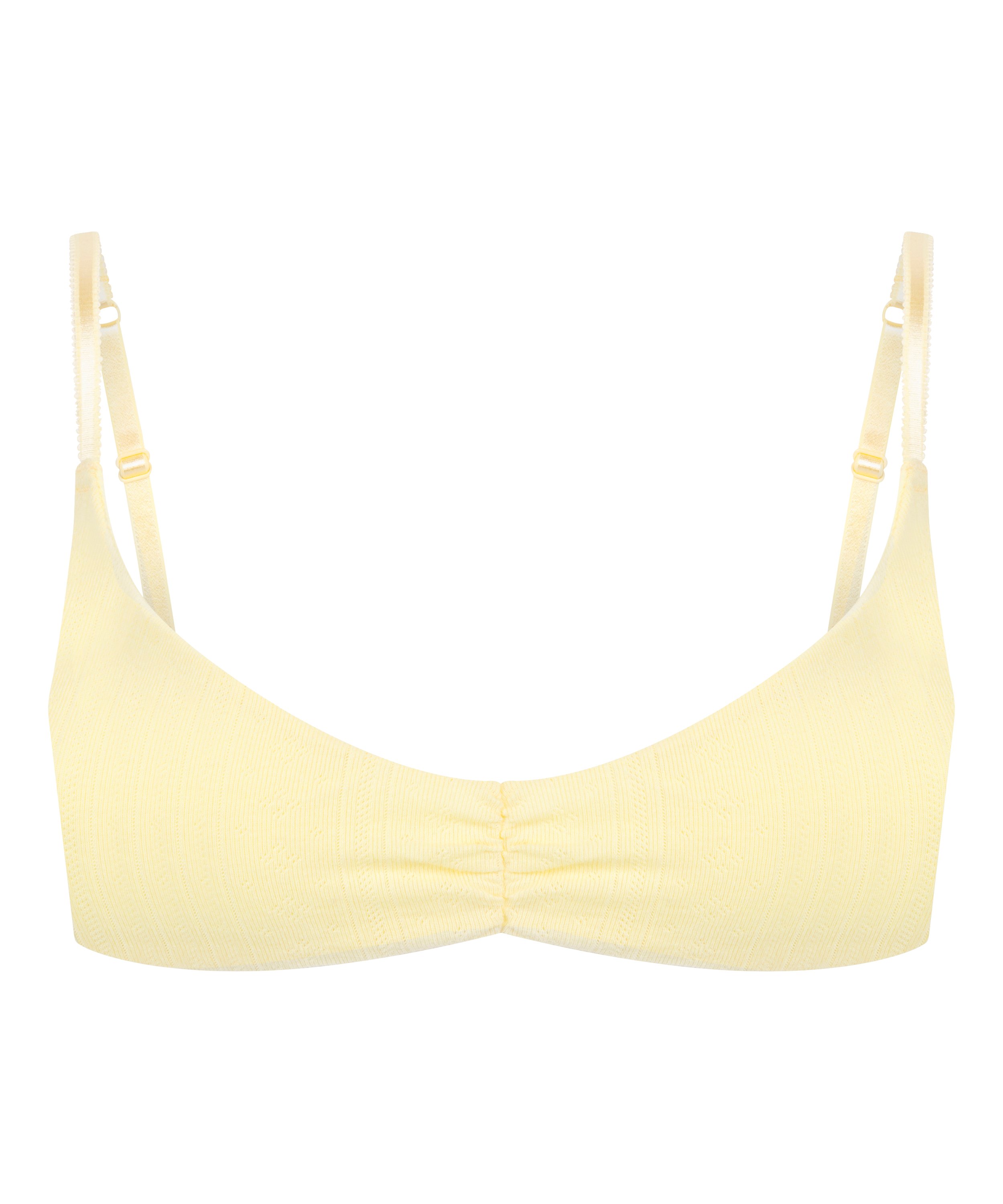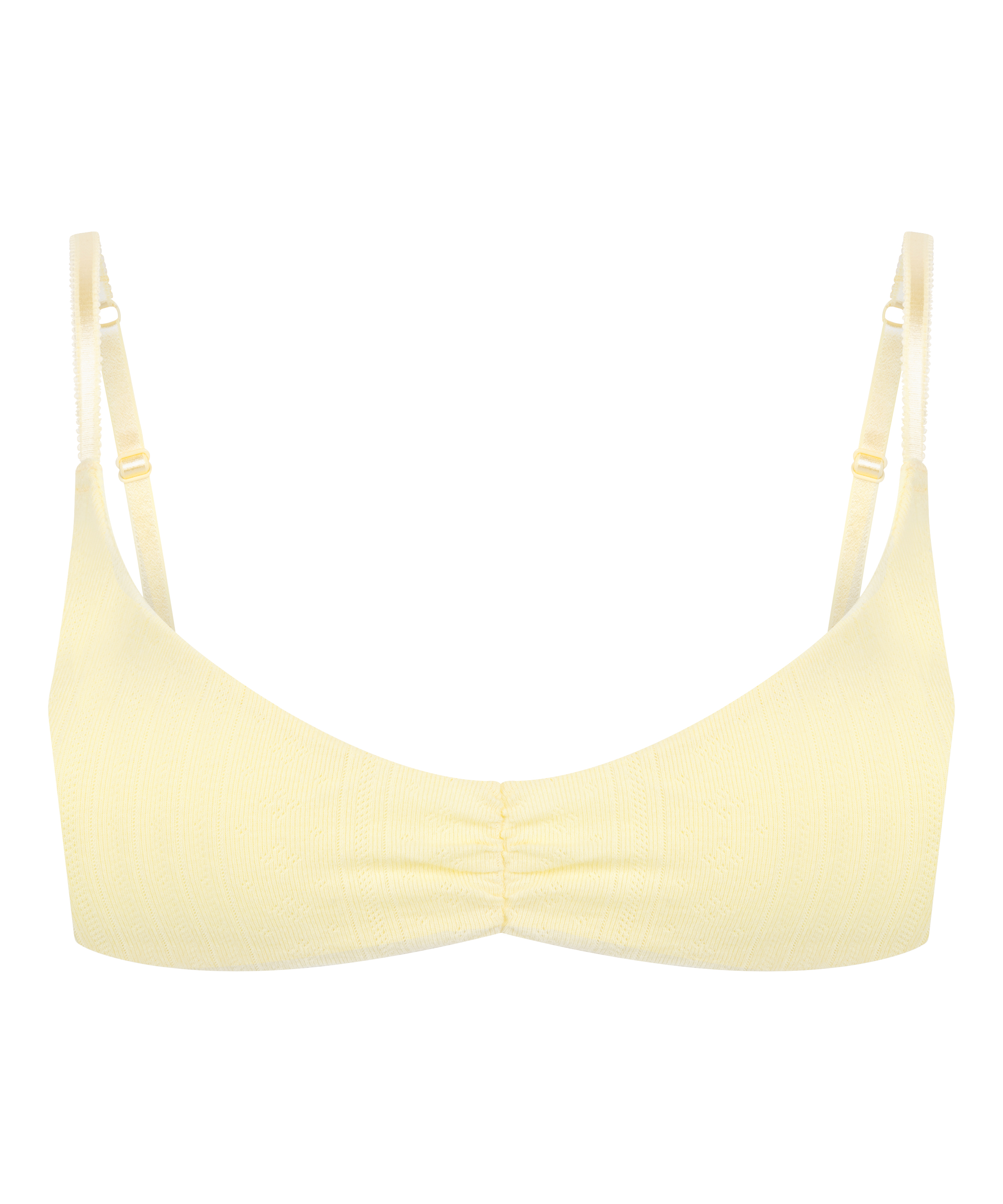 Odkryj najwyższy komfort i odrobinę uroku w tej braletce. Miękka tkanina pointelle zapewnia wygodne dopasowanie, a subtelna faktura dodaje delikatności. Marszczenia z przodu podkreślają naturalny kształt braletki, nadając jej eleganckie wykończenie