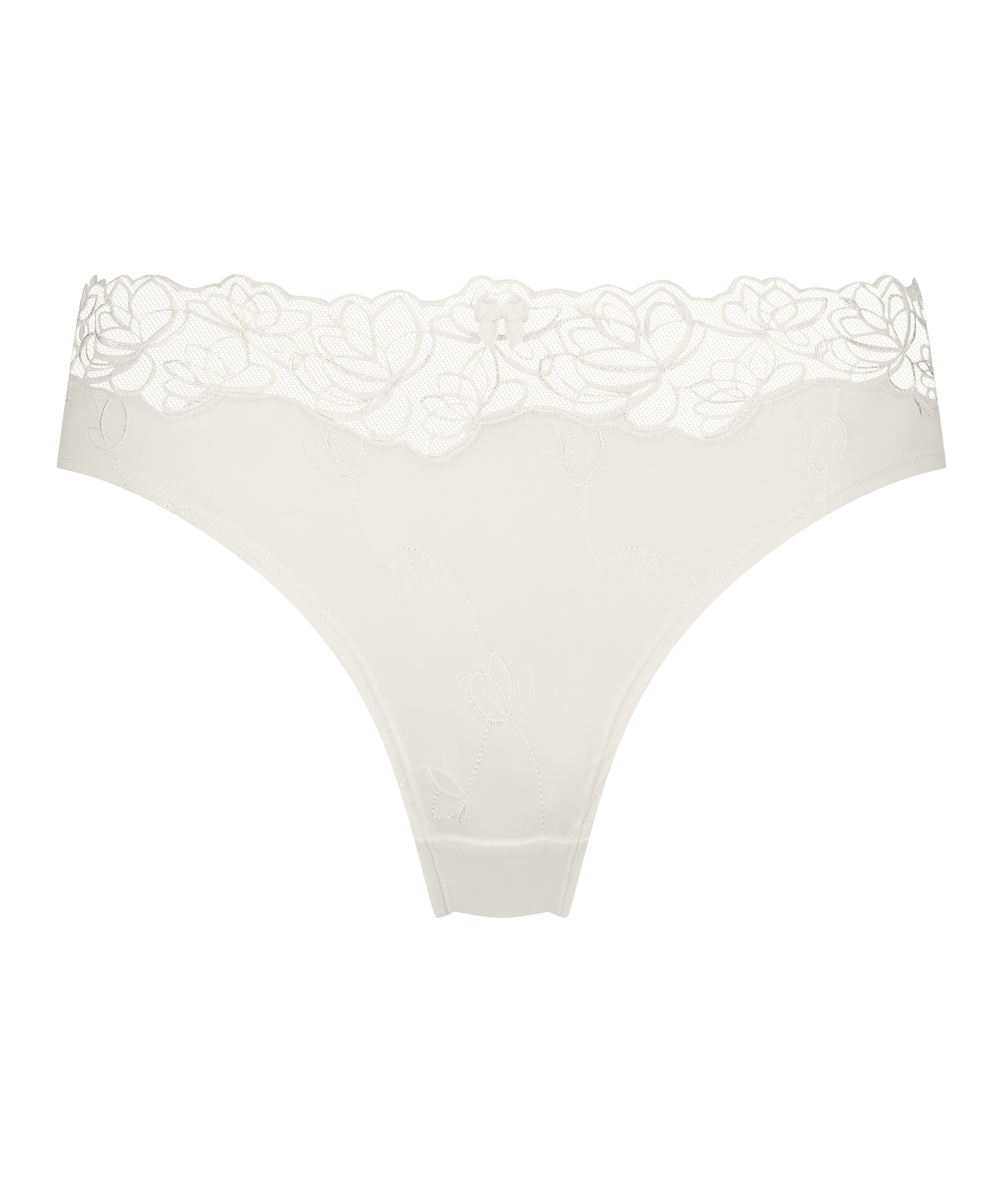 Te figi są wykonane z elastycznego, dopasowującego się do ciała materiału i ozdobione są kwiatowym haftem oraz małą kokardką z przodu.