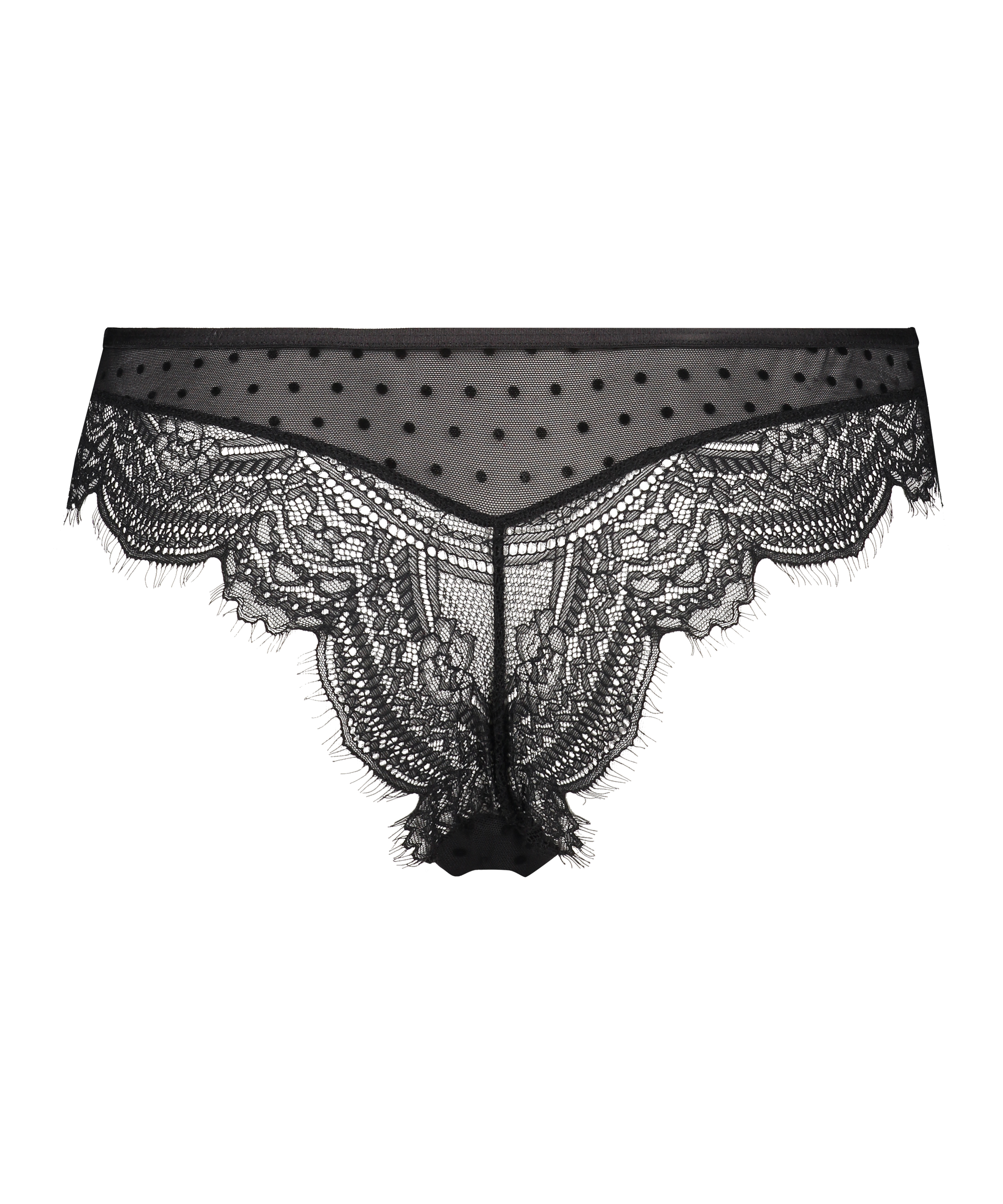 Te brazyliany to prawdziwy must-have! Te majtki mają koronkowe detale i wycięcia. Materiał jest pokryty ślicznymi kropkami. Połącz z dopasowanym biustonoszem lub braletką.