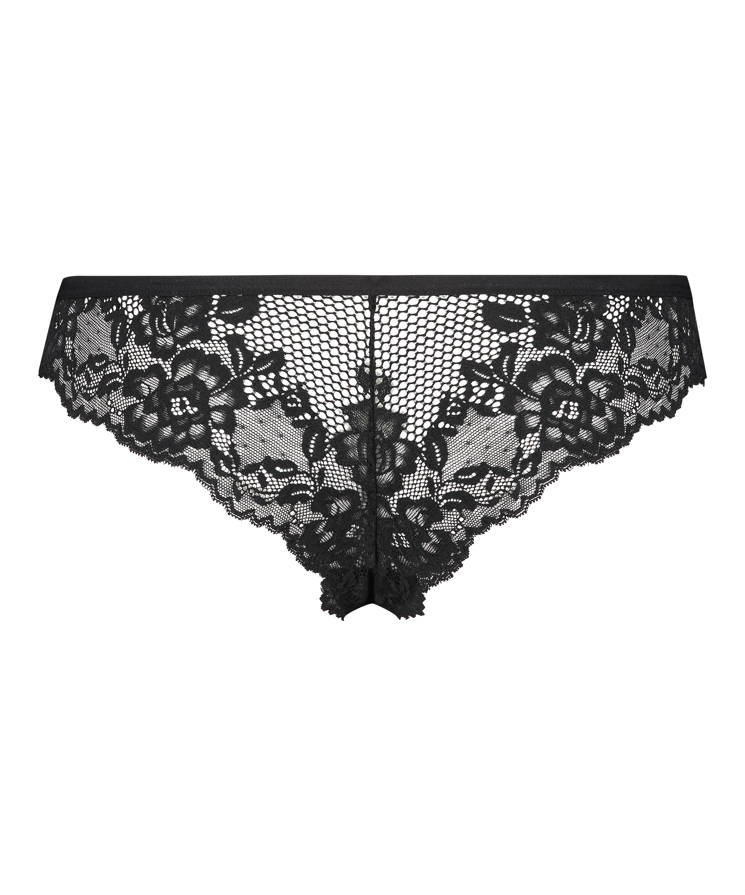 Te półprzezroczyste brazyliany są wykończone dużą ilością koronki. Ozdobę stanowi mała kokardka z przodu.