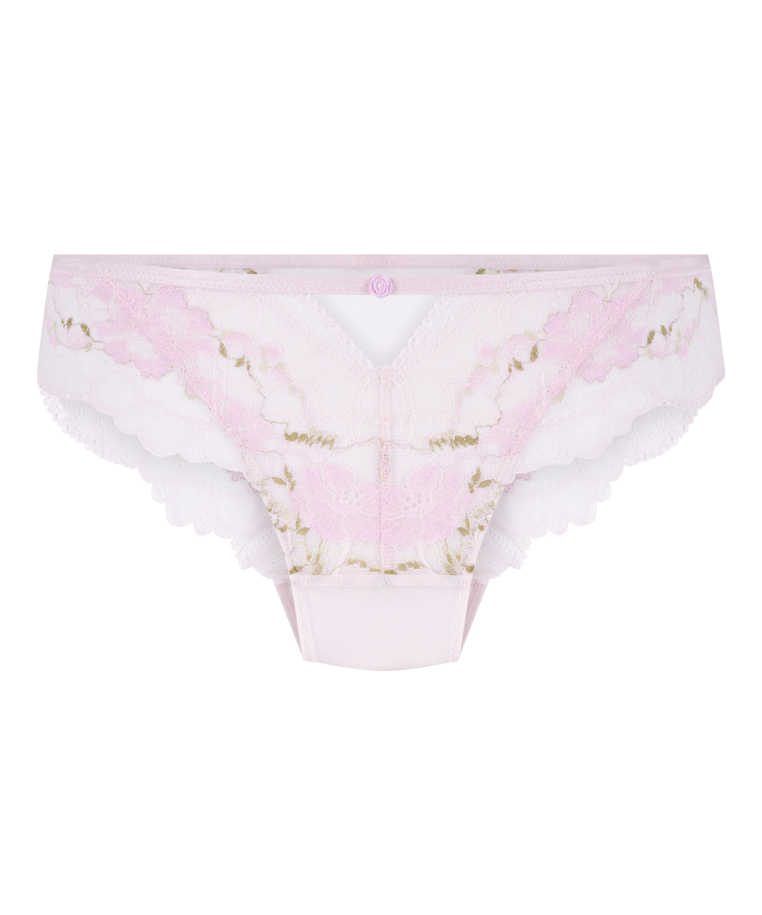 Dodaj zalotnego akcentu dzięki tym brazylianom, wykonanym z delikatnej koronki w kwiatowy wzór, z średnim pokryciem dla pochlebiającej sylwetki. Słodkie motywy róż nadają uroczego wykończenia. Połącz je z pasującym biustonoszem lub braletką, aby stworzyć skoordynowany zestaw.
