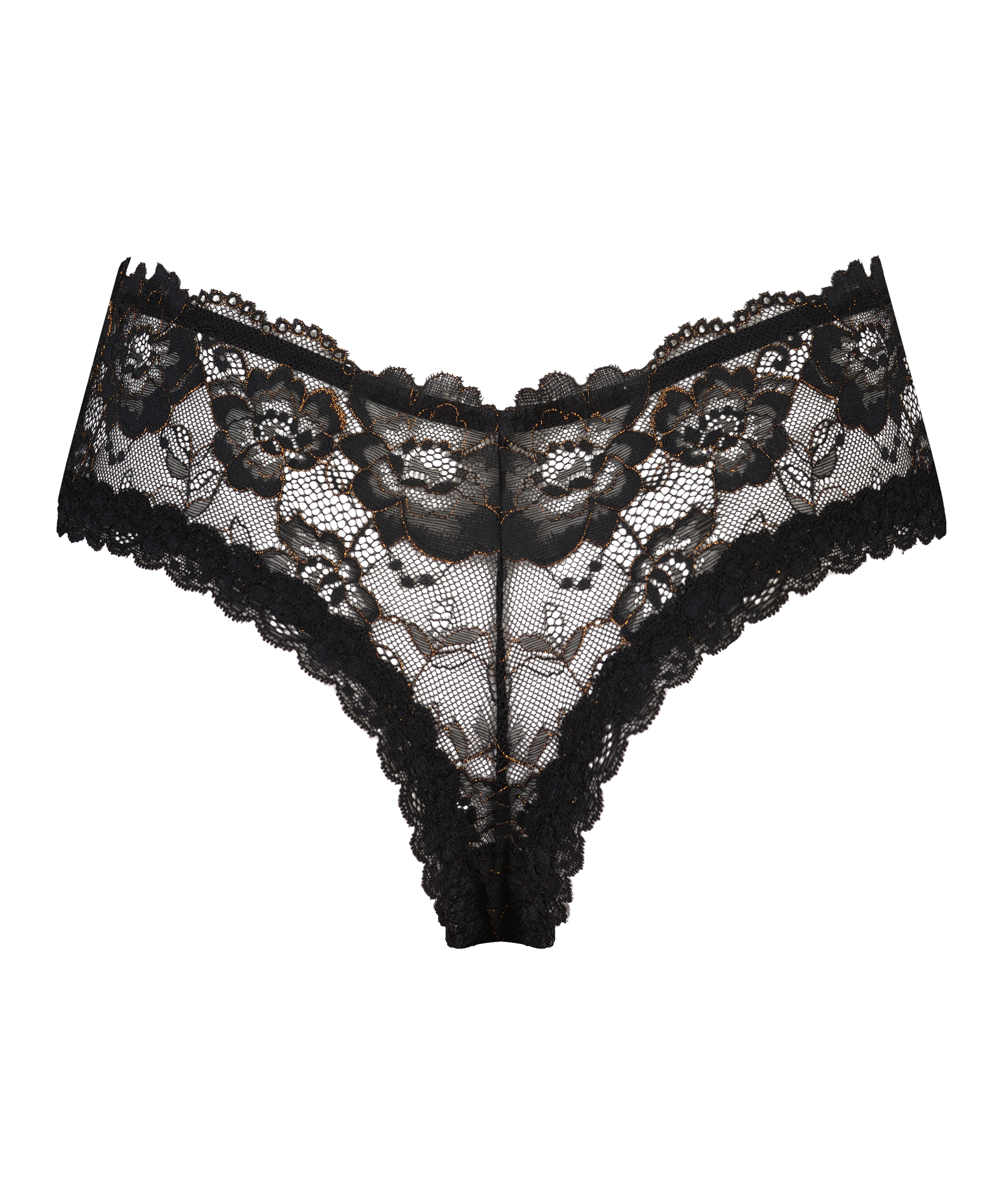 W tych brazylianach będziesz wyglądać zjawiskowo! Półprzezroczysty wygląd z mnóstwem koronkowych detali z lureksu na całym przodzie i z tyłu. Wykończenie za pomocą uroczej kokardki z przodu. Wymieszaj i dopasuj z odpowiednim biustonoszem!