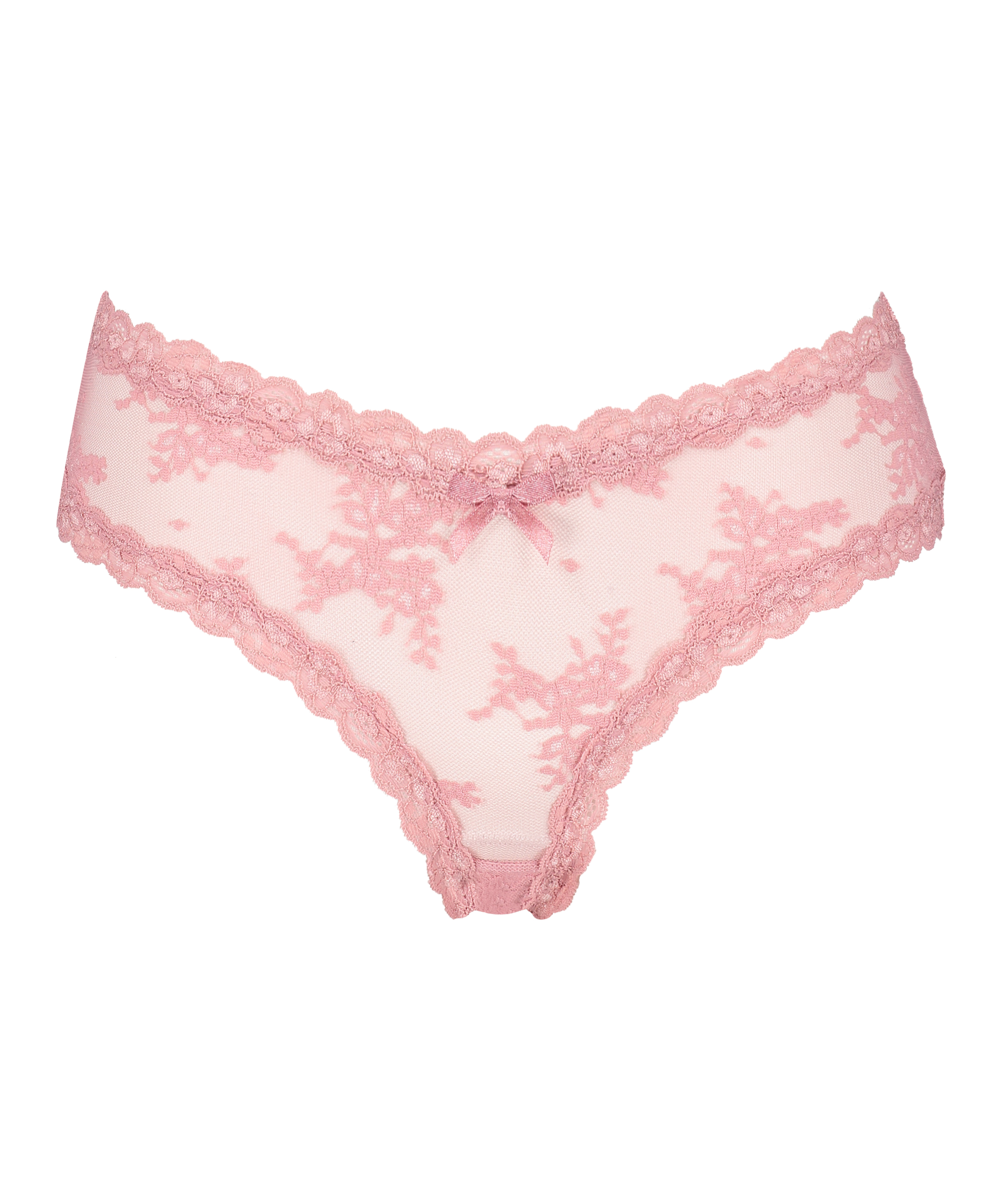 Te bardzo kobiece figi brazylijskie są wykończone koronkowym obrzeżem.