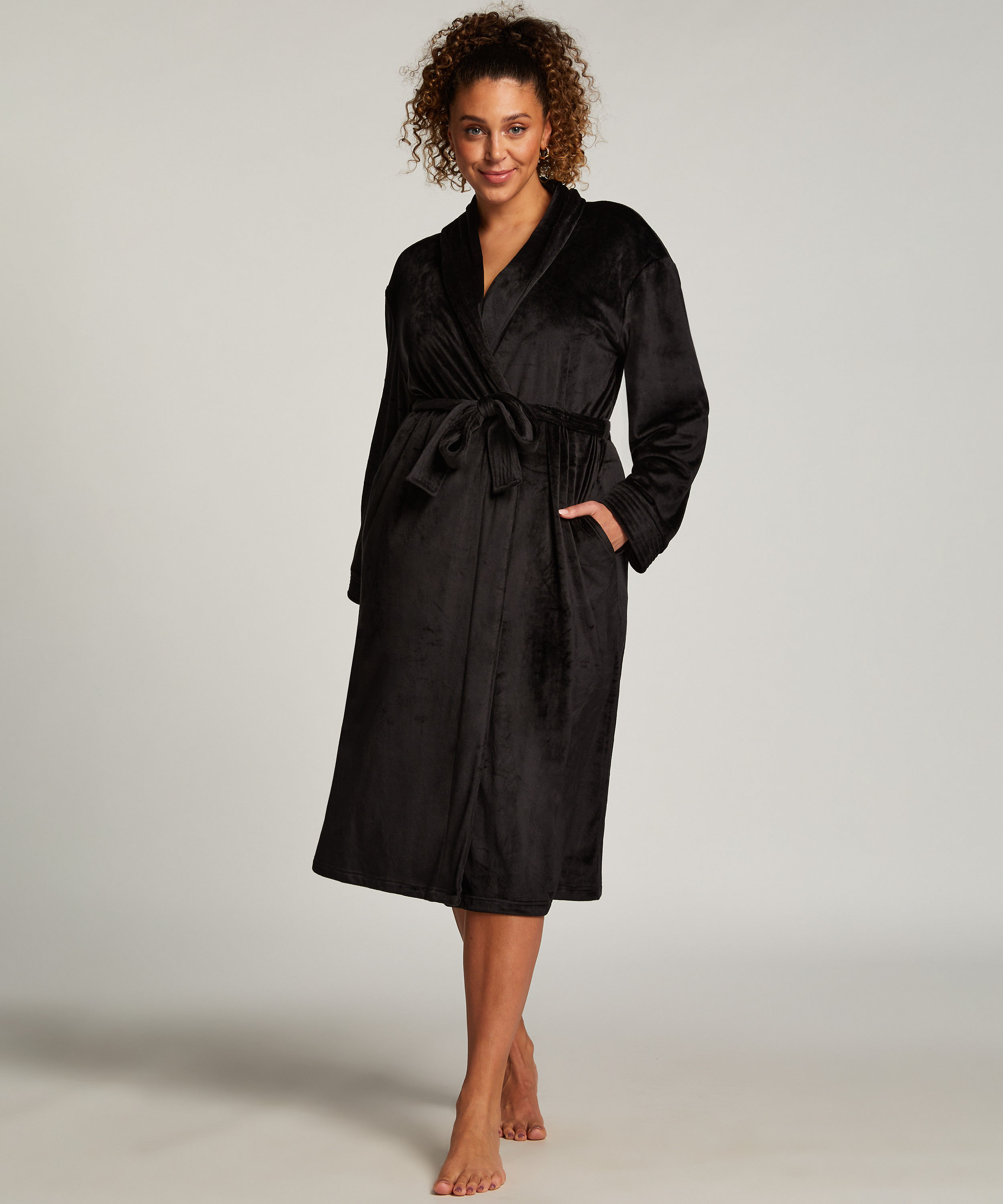 Ten uroczy, miękki szlafrok poniżej kolan jest wiązany szarfą i ma kieszenie po bokach.