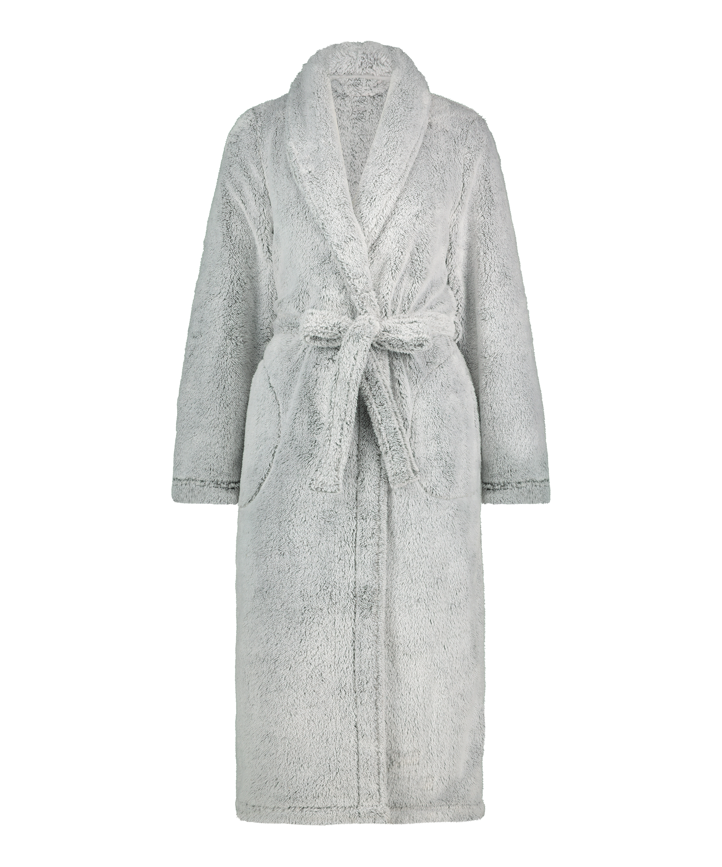 Ten uroczy, miękki szlafrok poniżej kolan jest wiązany szarfą i ma kieszenie po bokach.