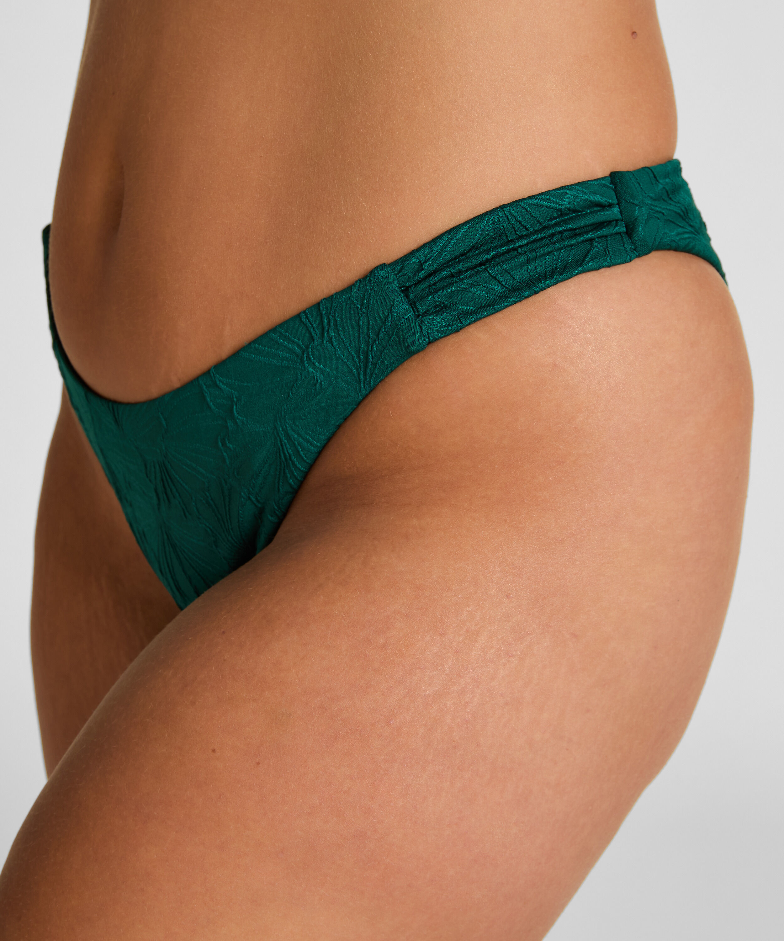 Uzupełnij swój plażowy look tymi brazylijskimi figami bikini highleg z delikatnym, haftowanym wzorem kwiatowym, który dodaje słodkiego i kobiecego akcentu. Zaprojektowane z wysokim stanem i zalotnym tyłem – idealne, by pokazać odrobinę ciała, zachowując komfort. Połącz je z pasującym topem bikini, tworząc uroczy, skoordynowany zestaw.