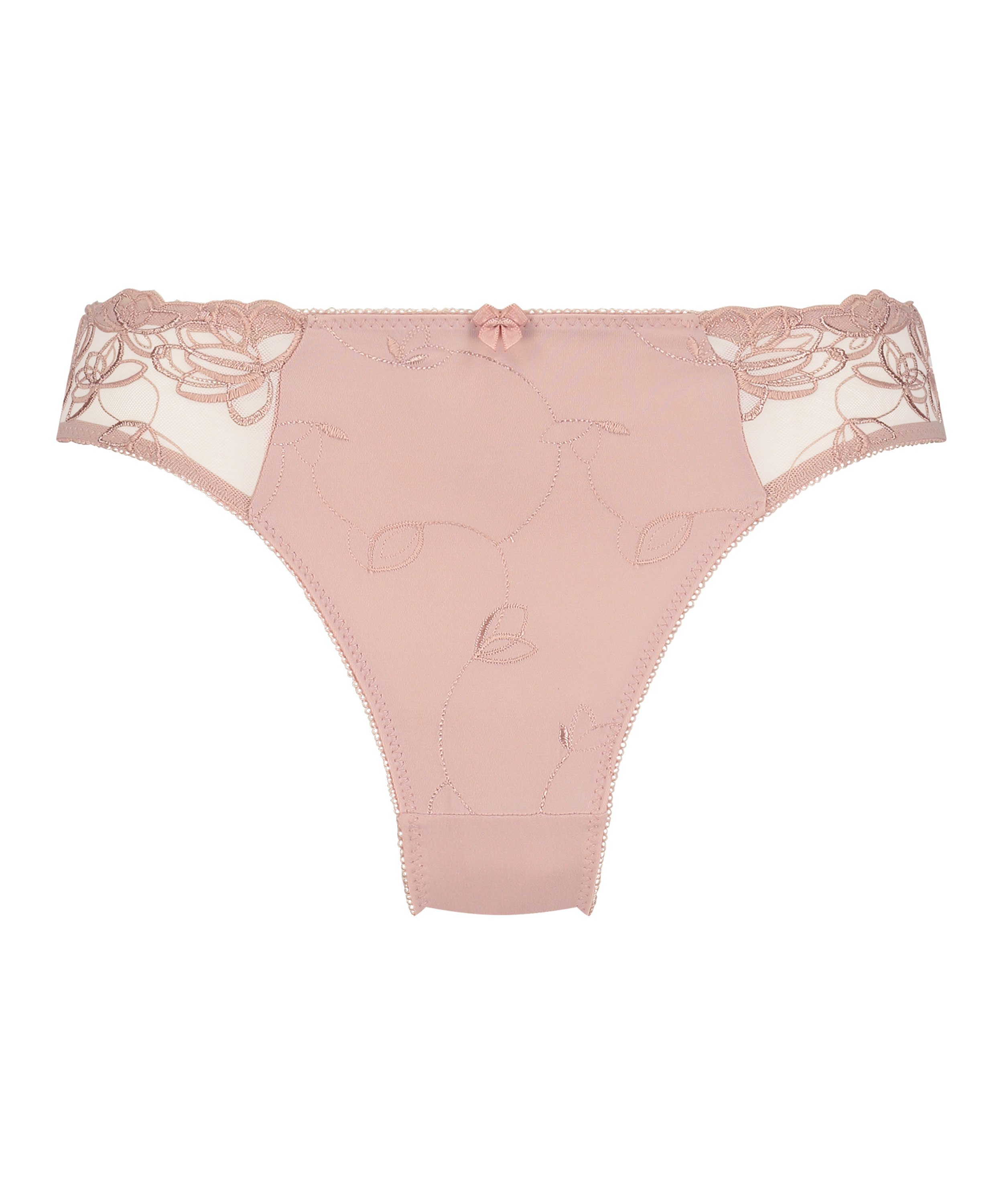 Te figi są wykonane z elastycznego, dopasowującego się do ciała materiału i ozdobione są kwiatowym haftem oraz małą kokardką z przodu.