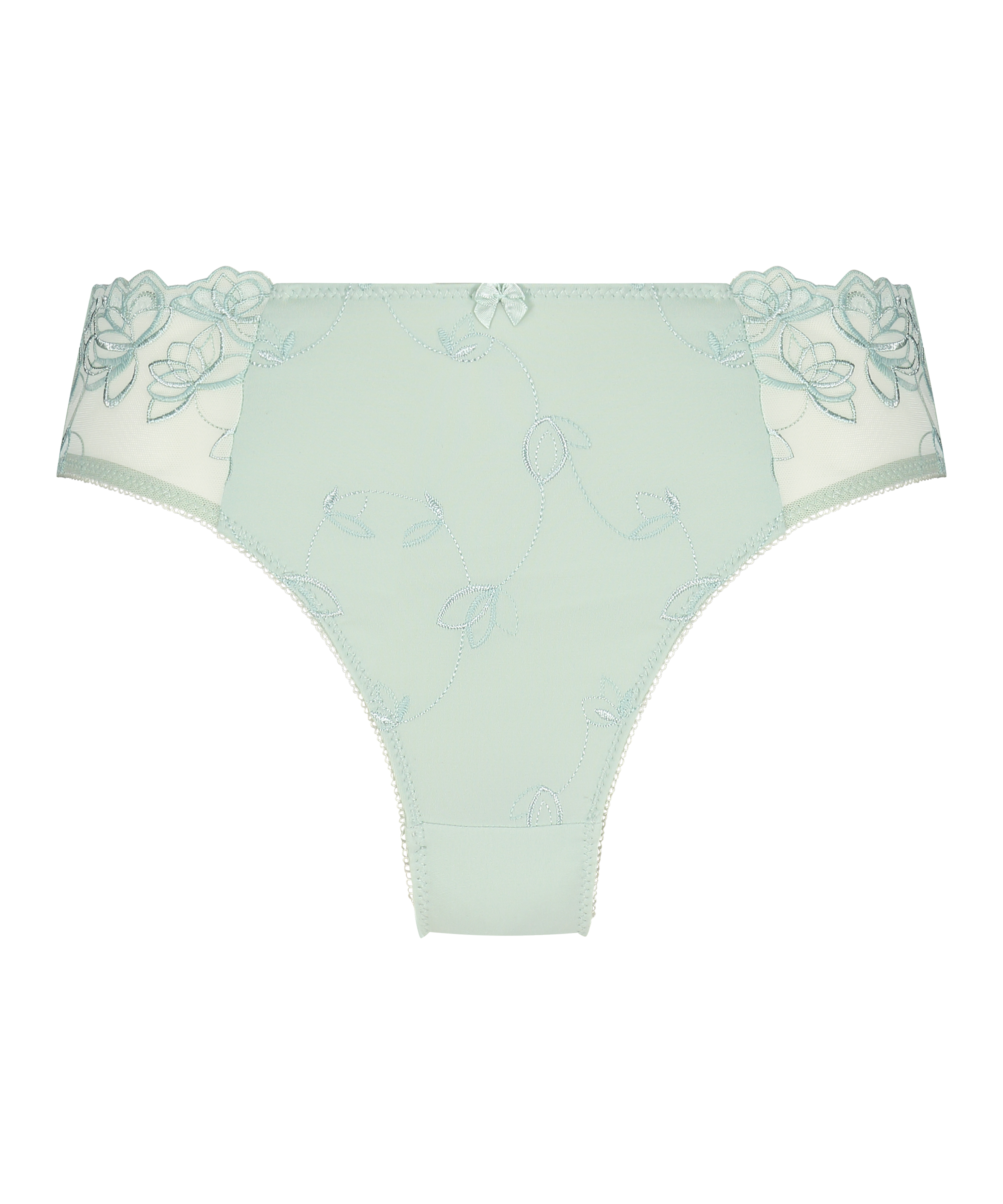 Te figi są wykonane z elastycznego, dopasowującego się do ciała materiału i ozdobione są kwiatowym haftem oraz małą kokardką z przodu.