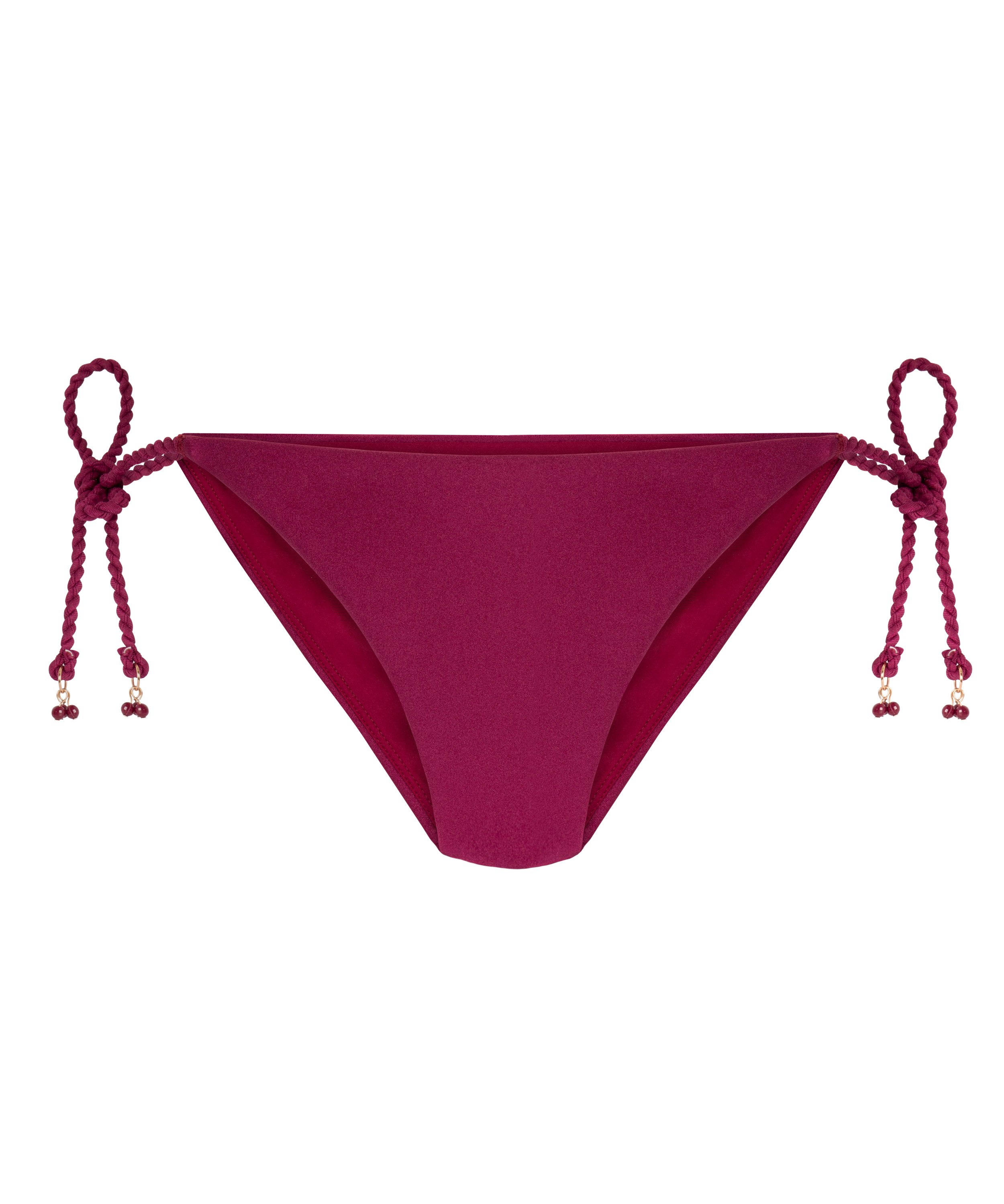 Dół bikini typu tanga z pięknym wzorem węzłów na biodrach, wykończony małymi koralikami. Figi w całości podszyte niewidocznymi szwami dla zapewnienia gładkiego i wygodnego dopasowania. Noś ze swoją ulubioną górą od bikini.