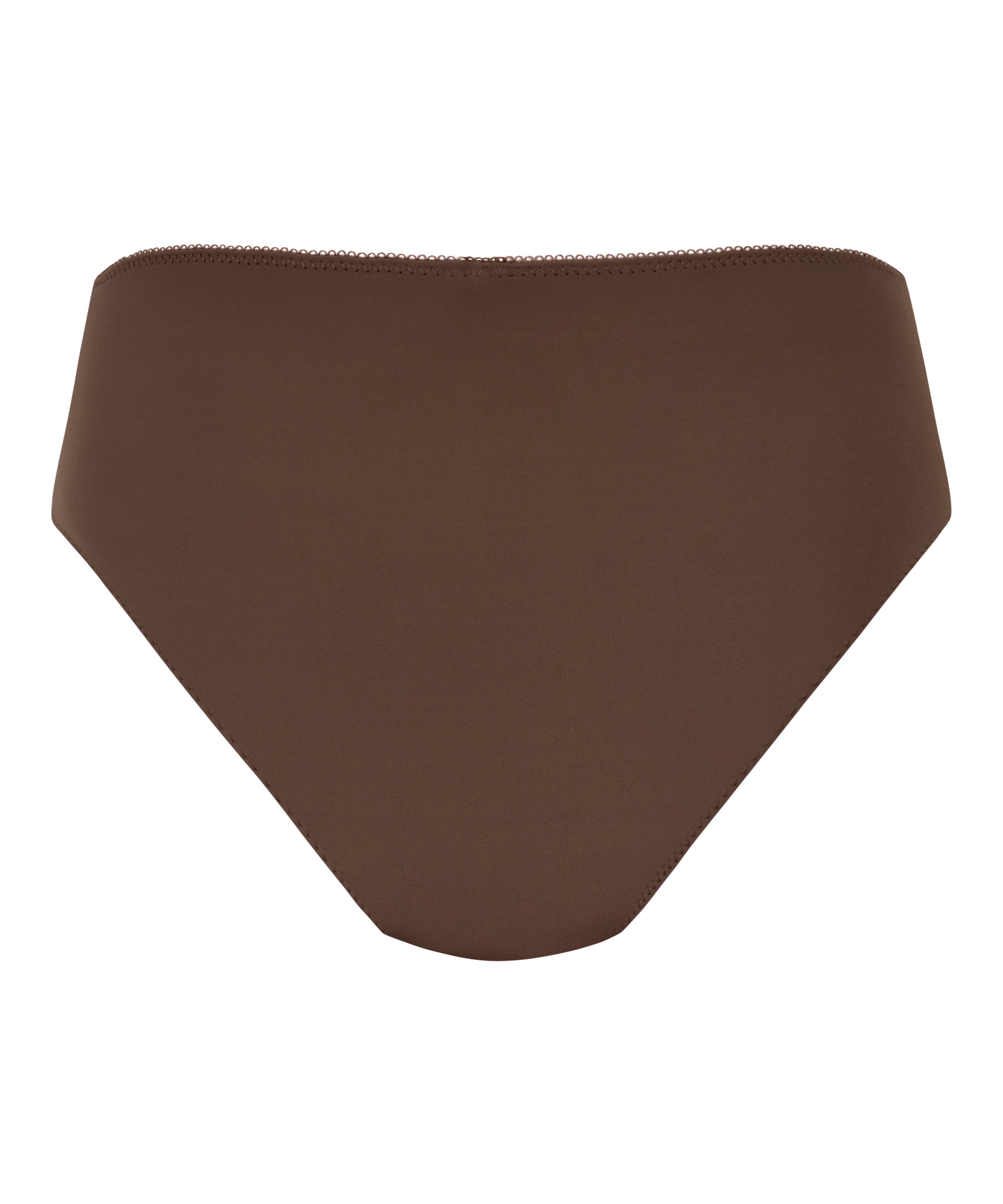 Te figi z wysokim stanem są wykonane z elastycznego, dopasowującego się do ciała materiału i ozdobione są kwiatowym haftem oraz małą kokardką z przodu.