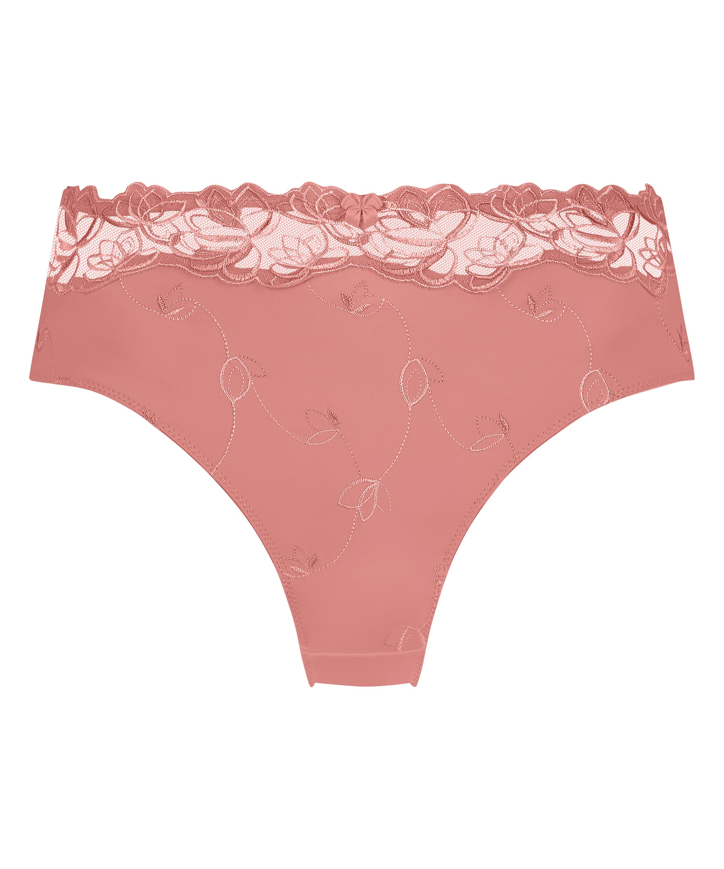 Te figi z wysokim stanem są wykonane z elastycznego, dopasowującego się do ciała materiału i ozdobione są kwiatowym haftem oraz małą kokardką z przodu.