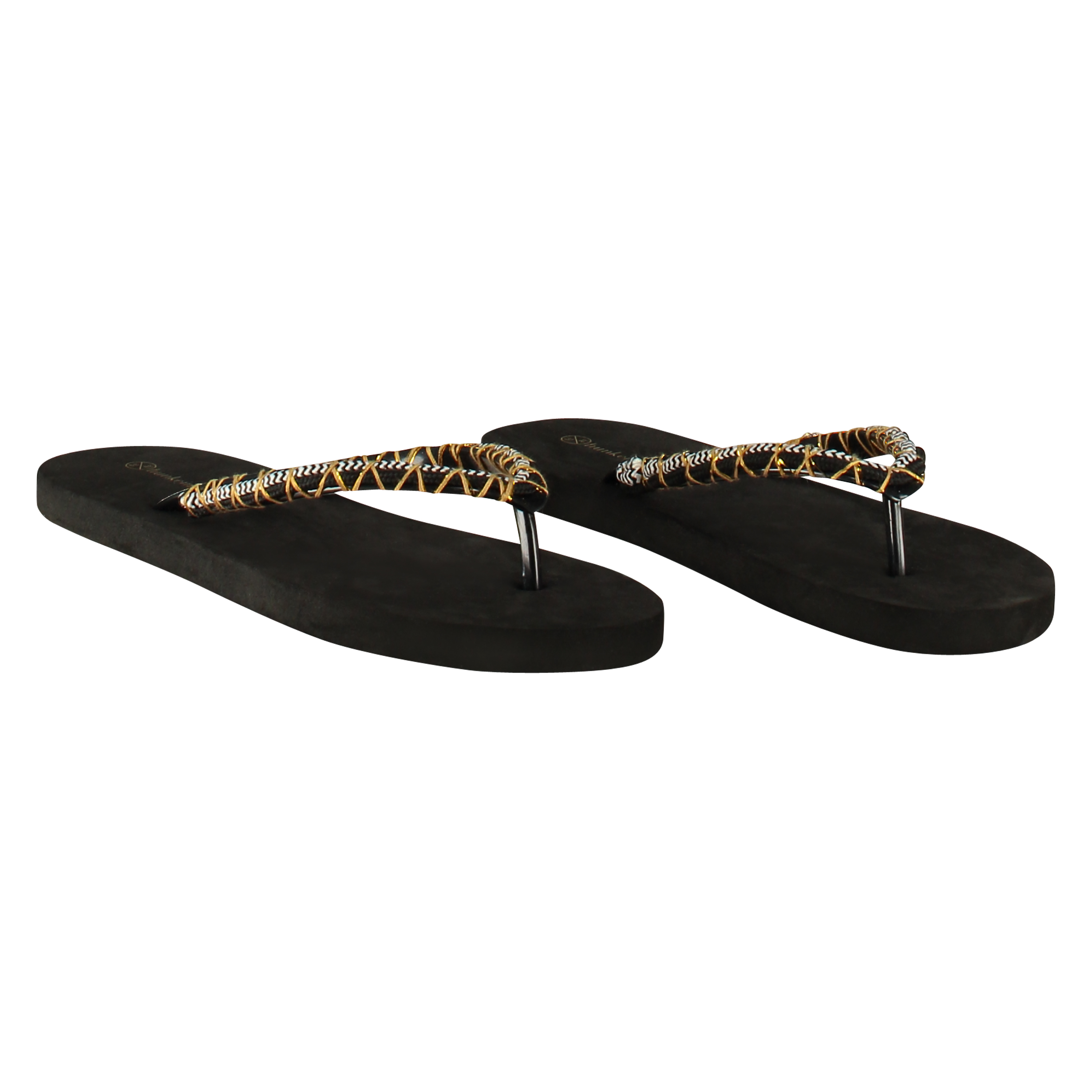 These blue flip-flops are an essential item in your summer collection. They are a plain bright blue colour and finished with orange/blue and black/white cords on the straps, fastened with a gold-coloured ribbon.