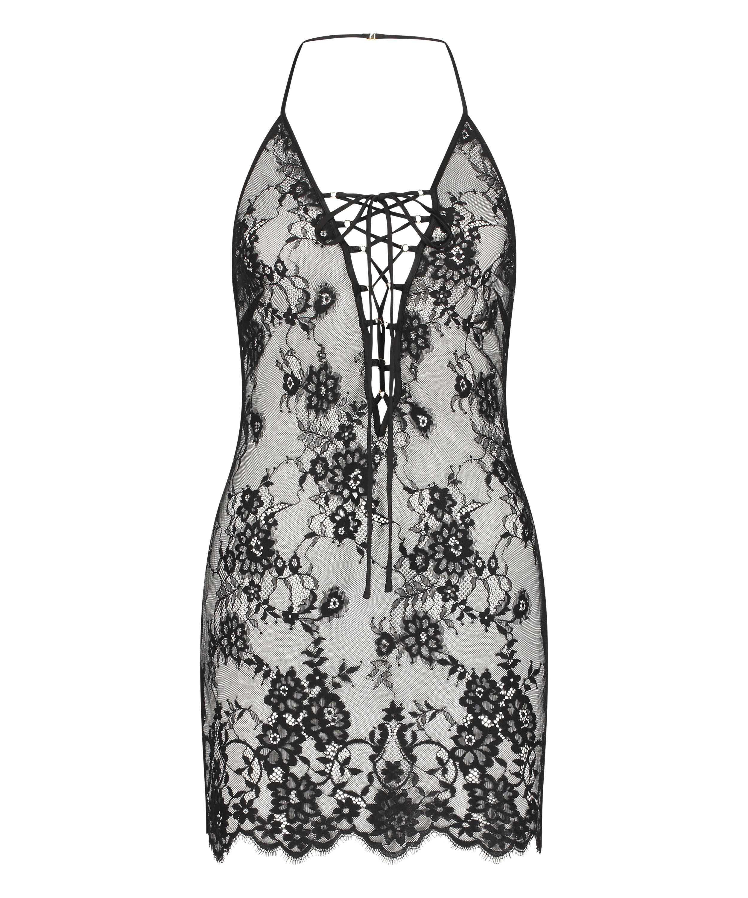 Wyglądaj fantastycznie w naszej koronkowej halce wiązanej na szyi! Ta półprzezroczysta sukienka jest wykonana z koronki i ma dekolt wiązany na szyi. Połącz ją z ładnym kimonem, aby uzupełnić swój wieczorowy wygląd.