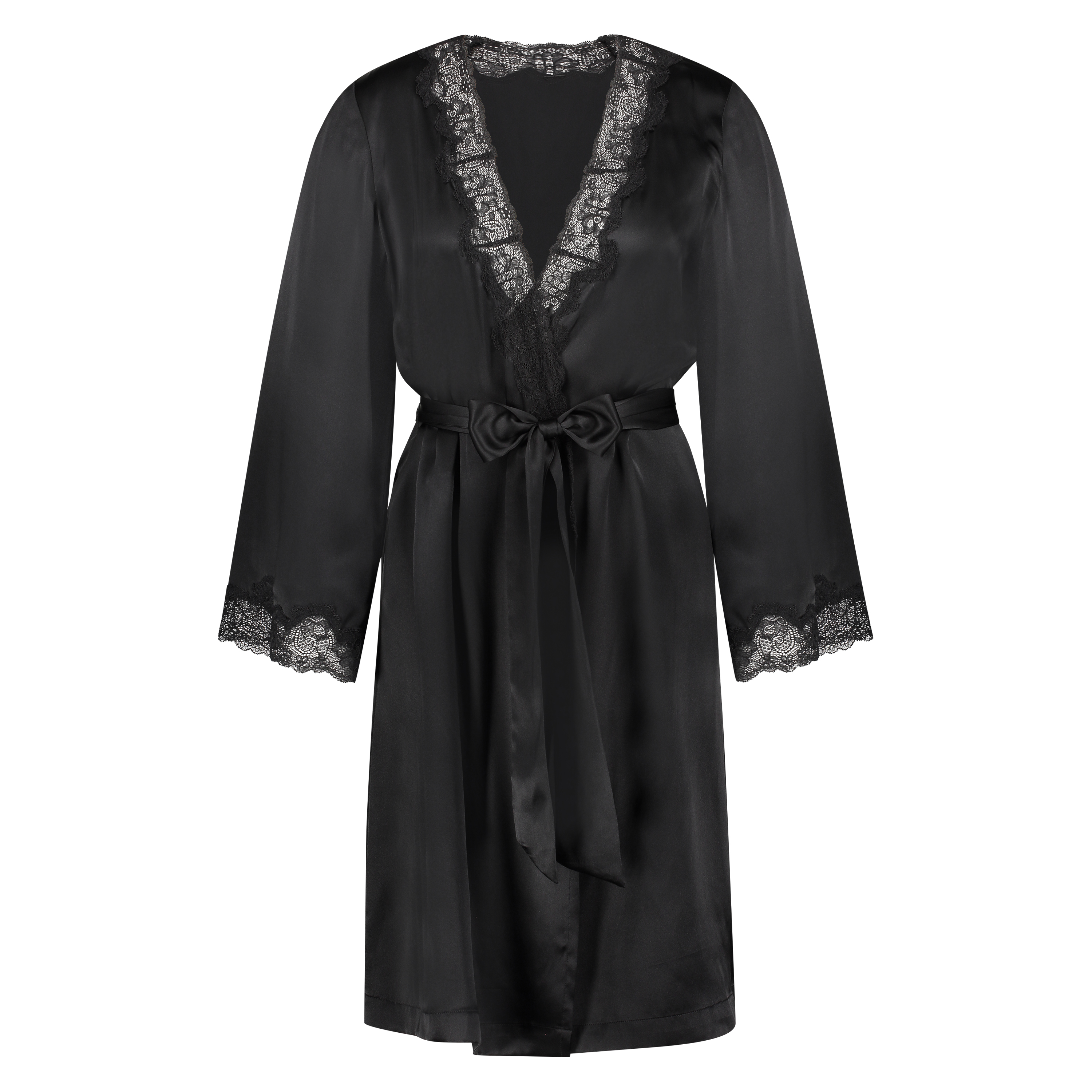 To kimono jest wykonane z jedwabiu jest bardzo miękkie! Ma koronkowe wykończenia na rękawach i z przodu. Część luksusowej kolekcji Noir. Połącz z dopasowanymi elementami.