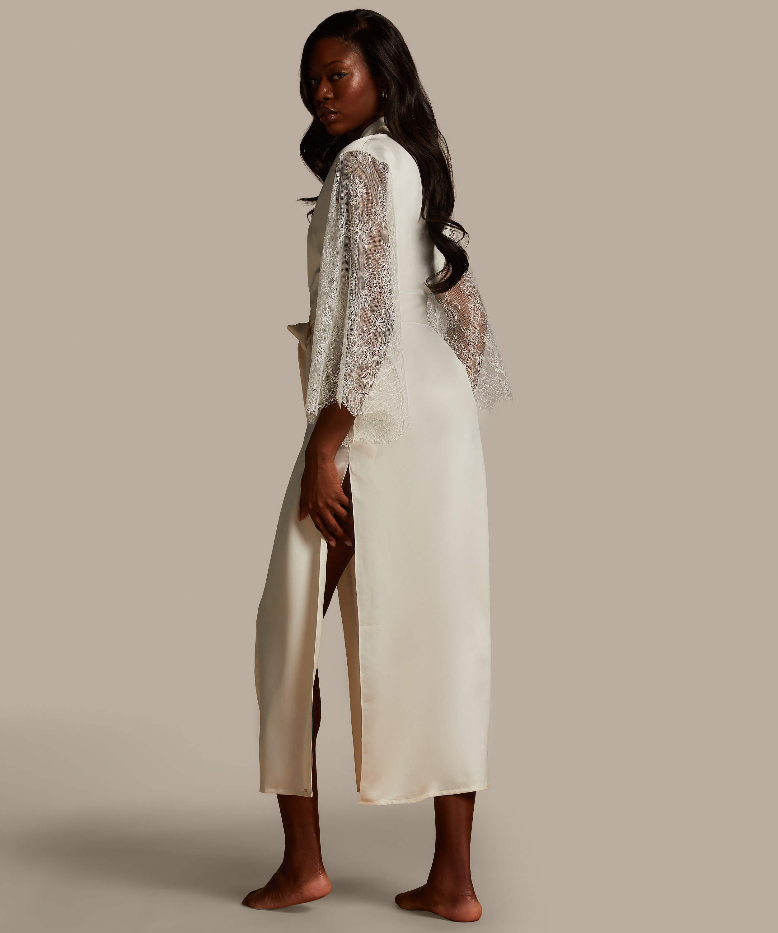 Nie przegap tego eleganckiego kimona! Z mnóstwem romantycznej koronki i prawdziwym wiązaniem. Urocze kimono ma szerokie rękawy i jest wykonane z satynowego materiału, co nadaje mu luksusowy wygląd. Połącz z dopasowanymi elementami. Część naszej kolekcji Noir.