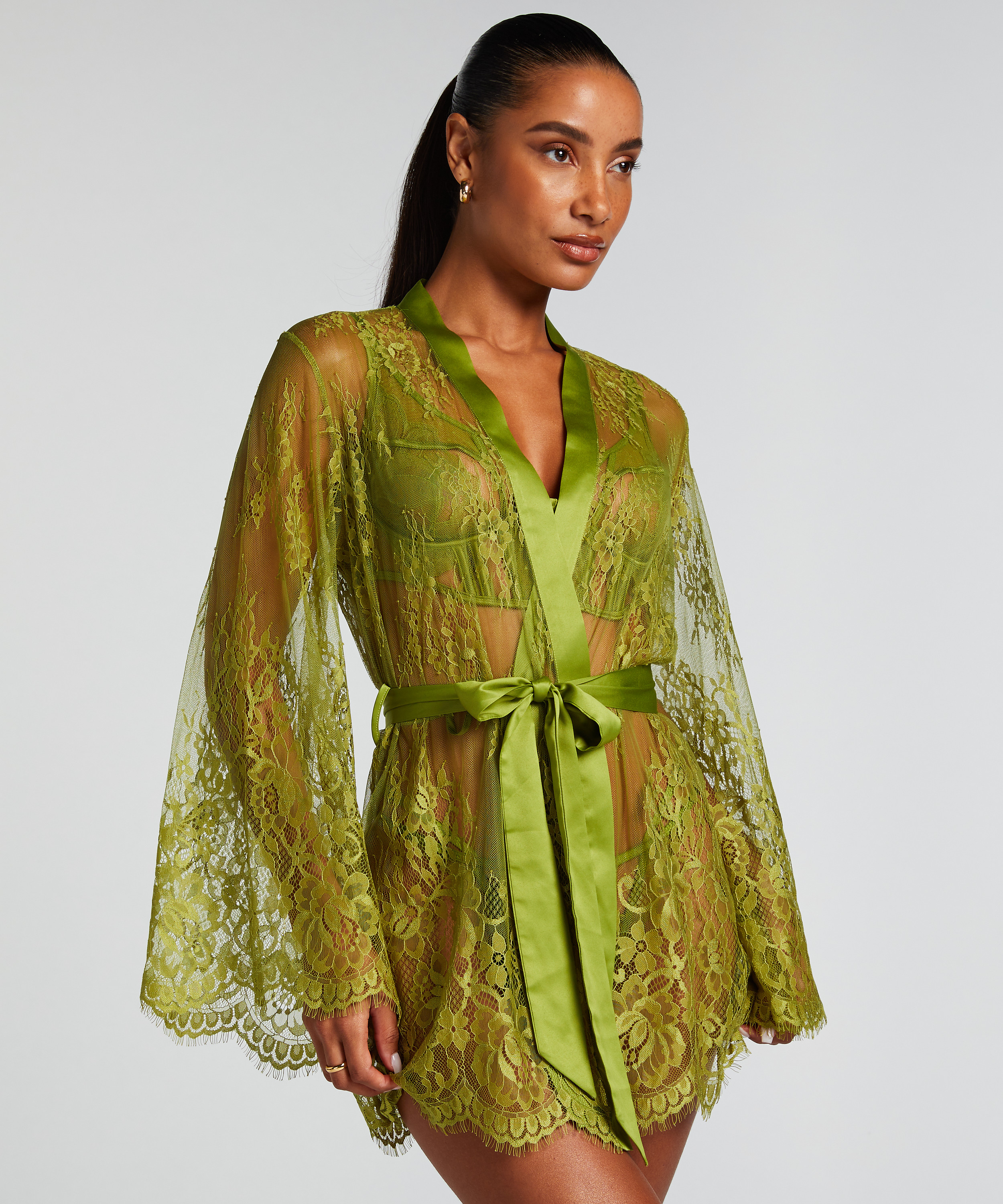 To kimono ma wszystko czego potrzebujesz: są seksowne, kobiece i mają dużo koronki. Wykonane jest z przezroczystej koronki z satynowymi detalami i ma zapięcie na guziki z przodu.
