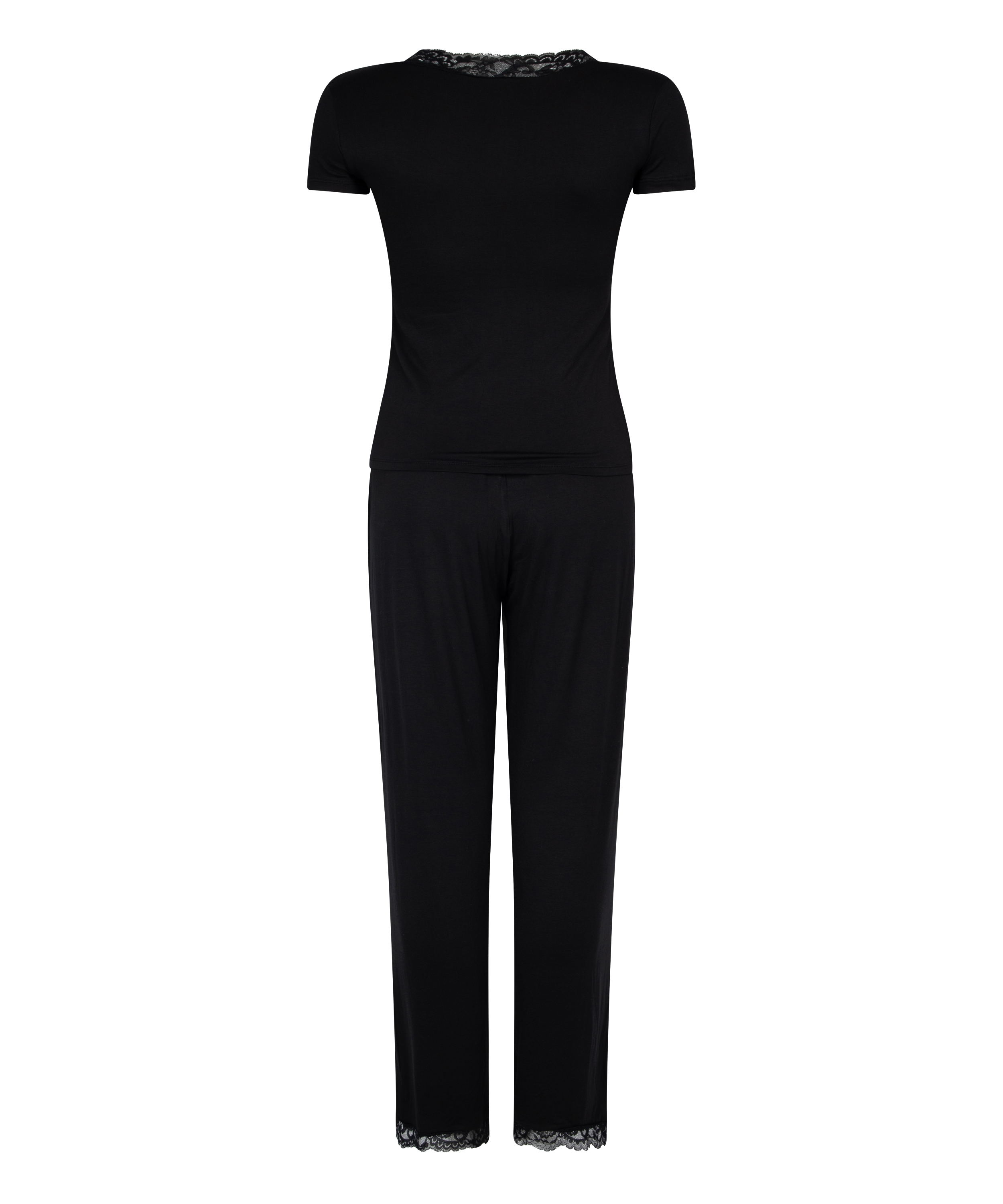 Zrelaksuj się stylowo w naszym komplecie piżamowym, zaprojektowanym z myślą o najwyższym komforcie i elegancji. Ten dwuczęściowy komplet składa się z miękkiej, przewiewnej góry z krótkimi rękawami i efektownym dekoltem w szpic ozdobionym koronką. W połączeniu z długimi, przewiewnymi spodniami zapewnia luźne dopasowanie i posiada koronkowe detale na dole. Ten zestaw doskonale sprawdzi się podczas wypoczynku lub spokojnego snu.