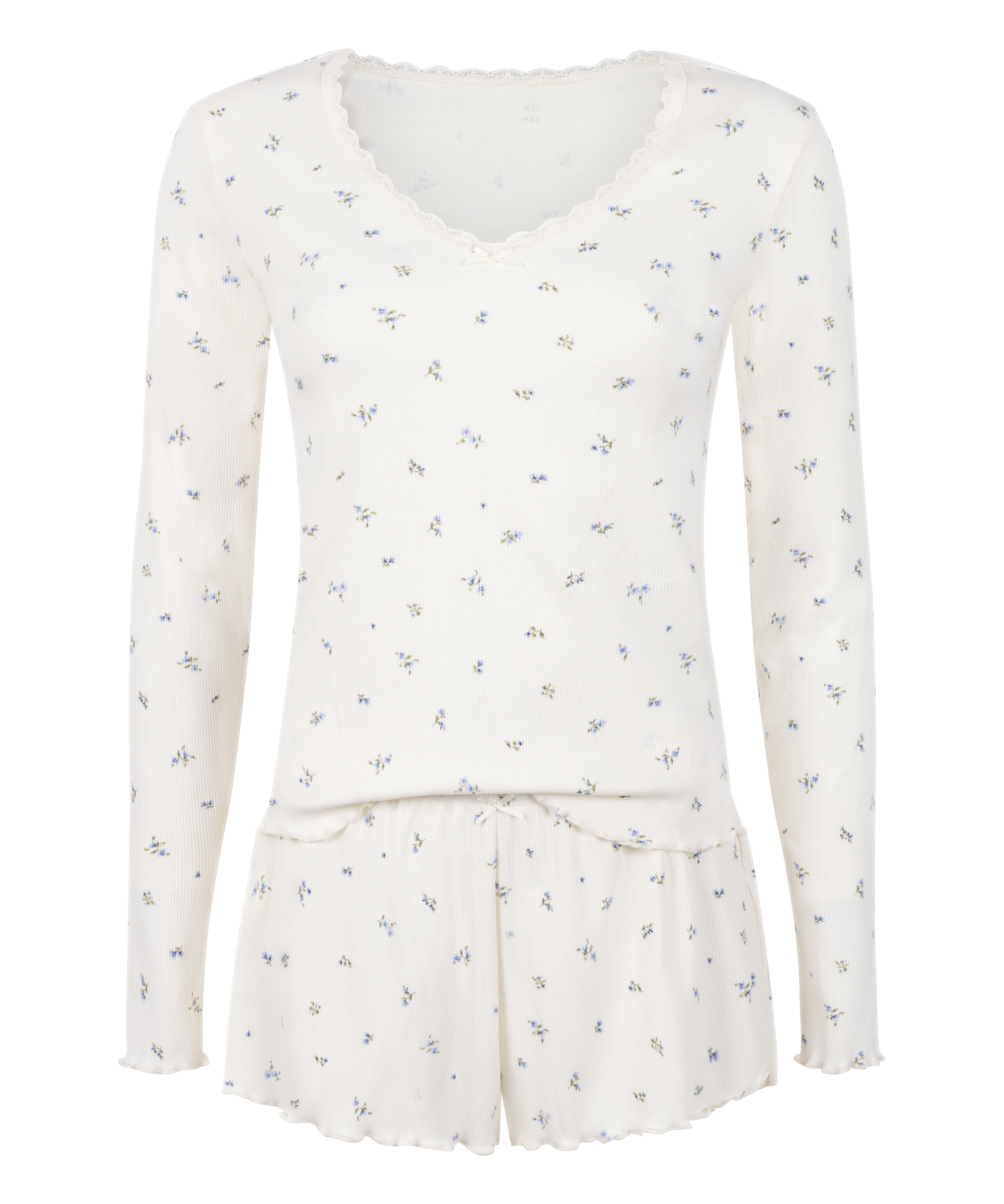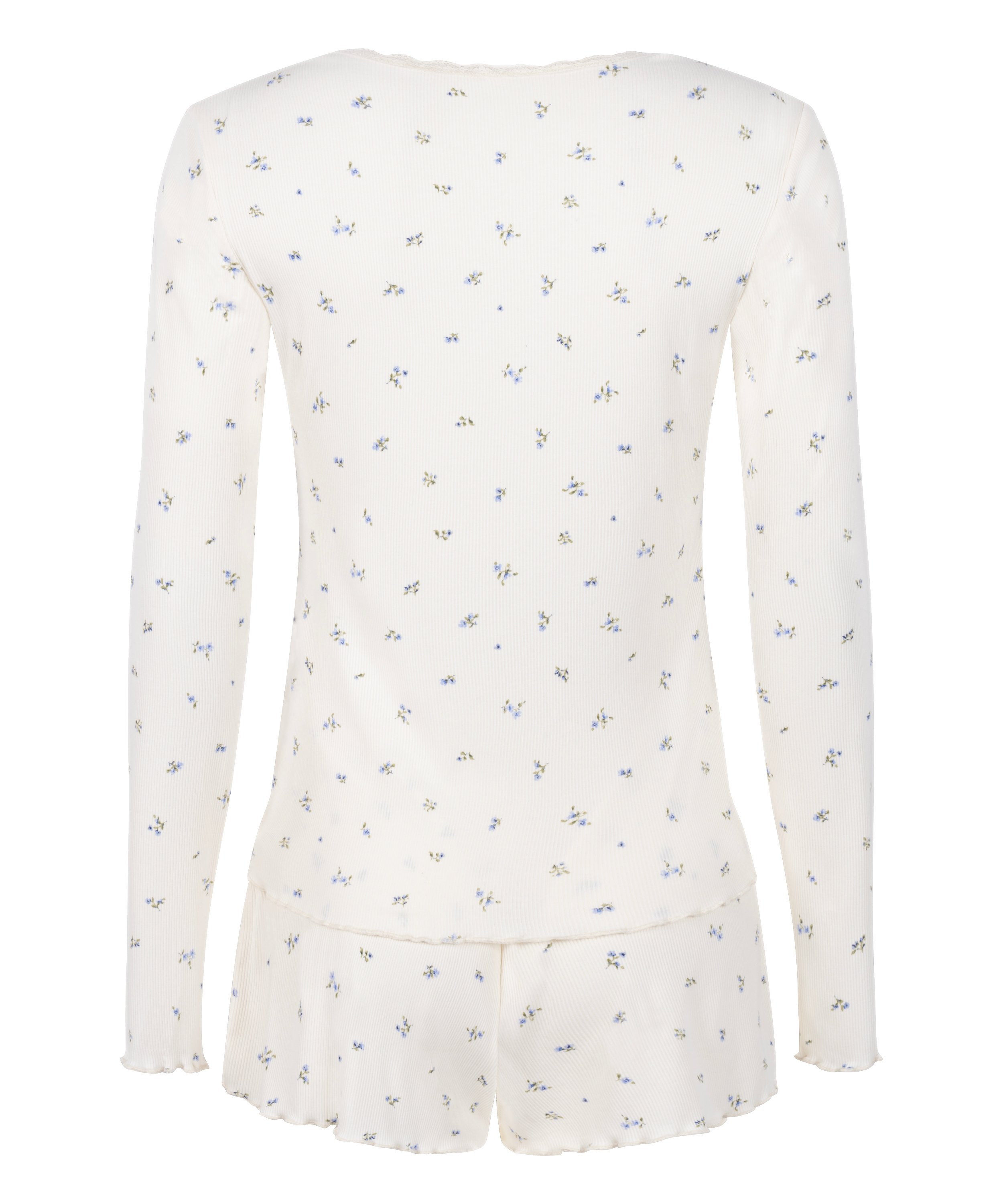 Ten komplet piżamy z prążkowanej bawełny łączy przytulny komfort z delikatnymi, kobiecymi detalami. Bluzka z długim rękawem wykonana jest z miękkiej tkaniny i ozdobiona koronką wzdłuż dekoltu i brzegów, dodając odrobinę elegancji do Twojej bielizny nocnej. Pasujące szorty są lekkie i przewiewne, wykończone dopasowaną koronką dla spójnego, uroczego wyglądu. Idealne do wypoczynku lub snu, miękka prążkowana bawełna zapewnia komfort przez całą noc.