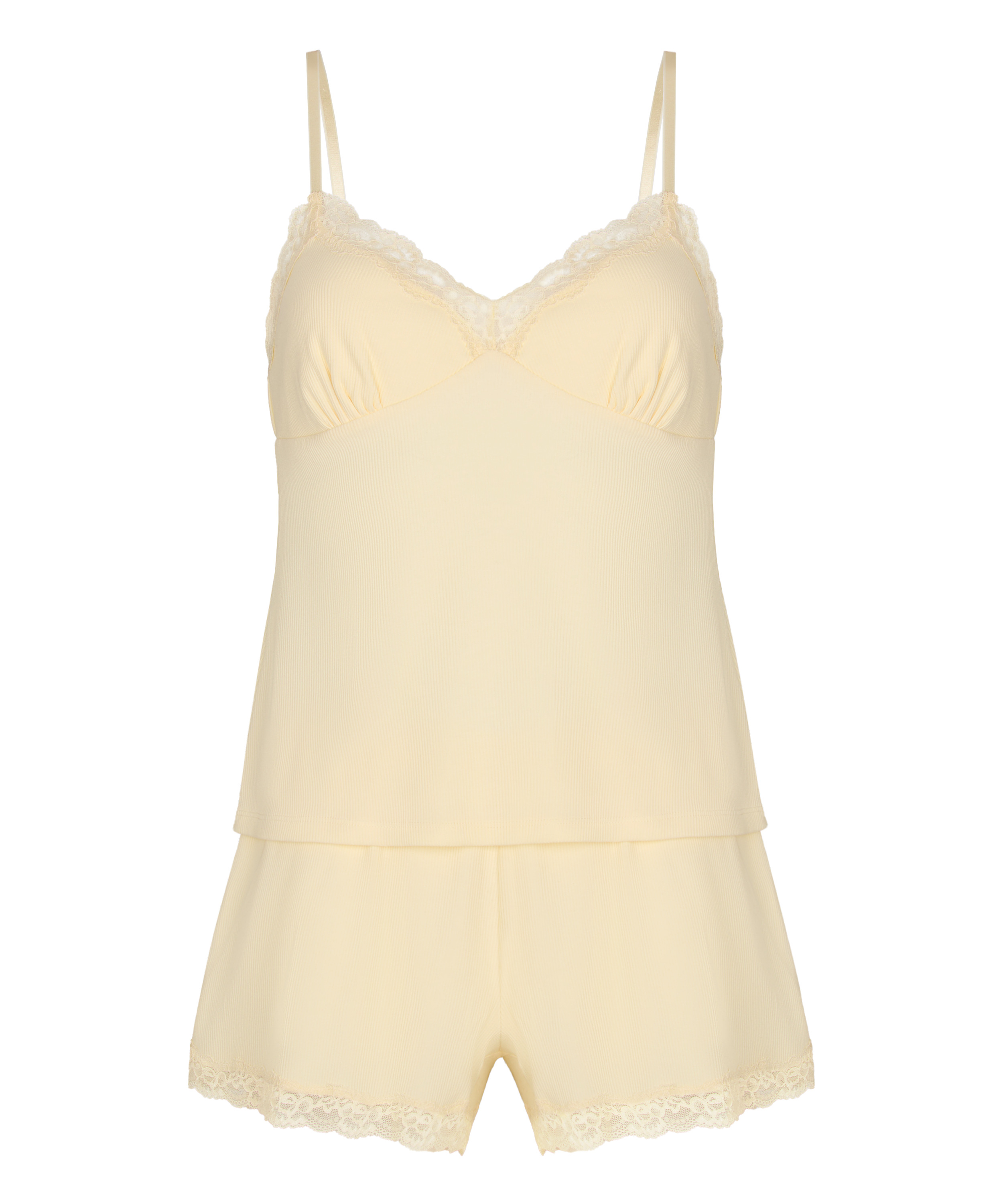 Ten komplet piżamy to idealne połączenie słodkiego i przytulnego, zaprojektowany na słodkie noce i relaksujące poranki. Wykonany z miękkiej prążkowanej bawełny, jest przewiewny i delikatny dla skóry, oferując wygodne, pochlebne dopasowanie. Top na ramiączkach i pasujące szorty są wykończone delikatną koronkową lamówką dla kobiecego akcentu. Zabawny i stylowy... girly vibe, w którym uwielbiasz się zrelaksować.