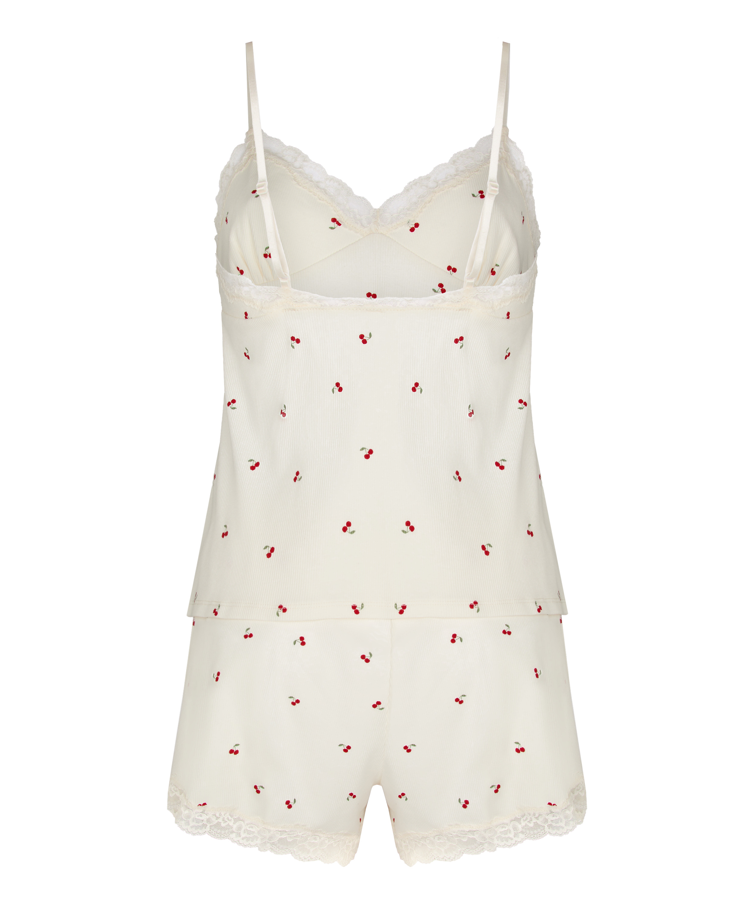 Ten komplet piżamy to idealne połączenie słodkiego i przytulnego, zaprojektowany na słodkie noce i relaksujące poranki. Wykonany z miękkiej prążkowanej bawełny, jest przewiewny i delikatny dla skóry, oferując wygodne, pochlebne dopasowanie. Top na ramiączkach i pasujące szorty są wykończone delikatną koronkową lamówką dla kobiecego akcentu. Zabawny i stylowy... girly vibe, w którym uwielbiasz się zrelaksować.