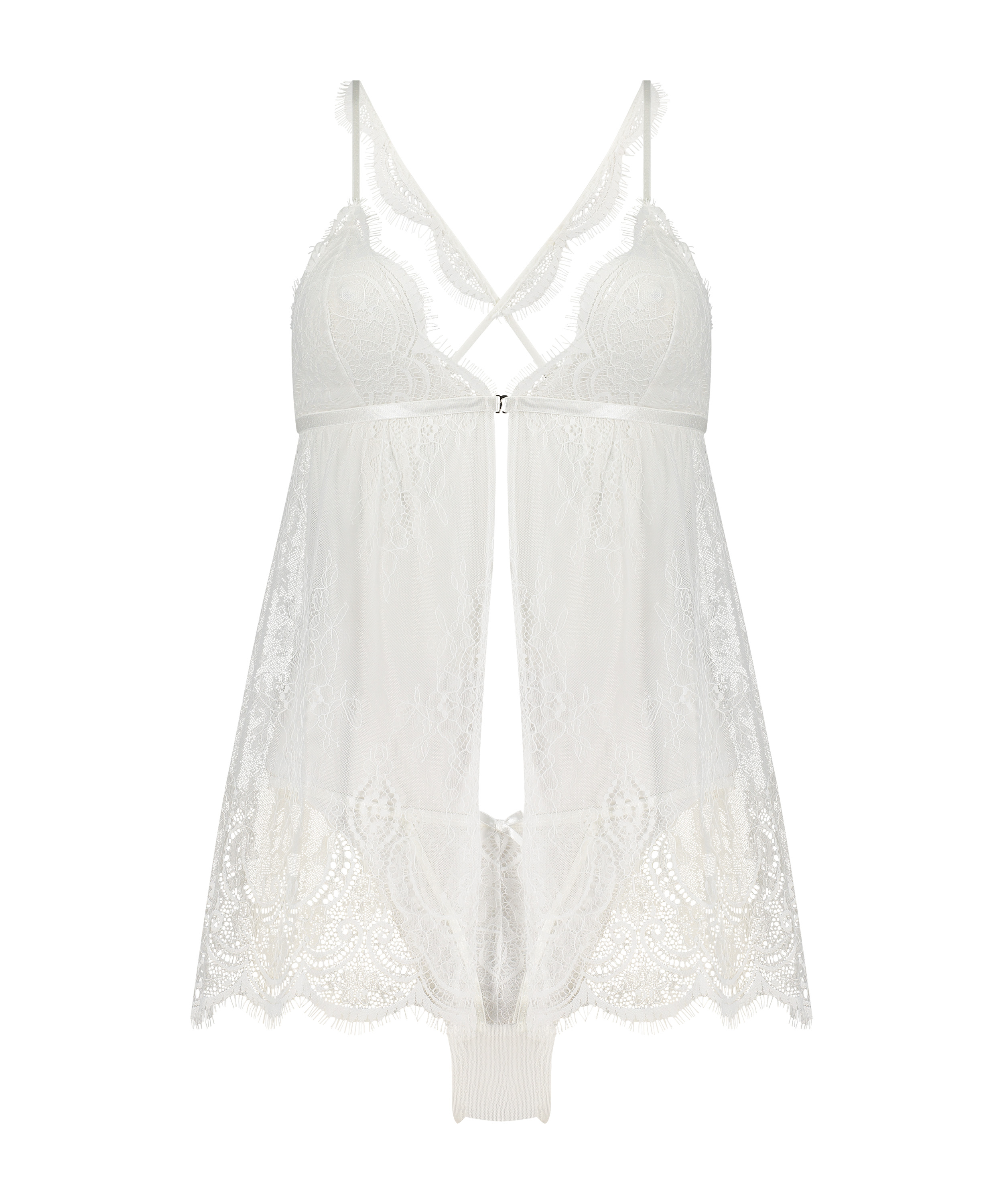 Ciesz się miesiącem miodowym w tej uwodzicielskiej babydoll! Wykonana jest z delikatnej koronki oraz ma zapięcie z przodu na zatrzask dla większej wygody. Uzupełnij stylizację dopasowanymi majtkami dołączonymi do kompletu!