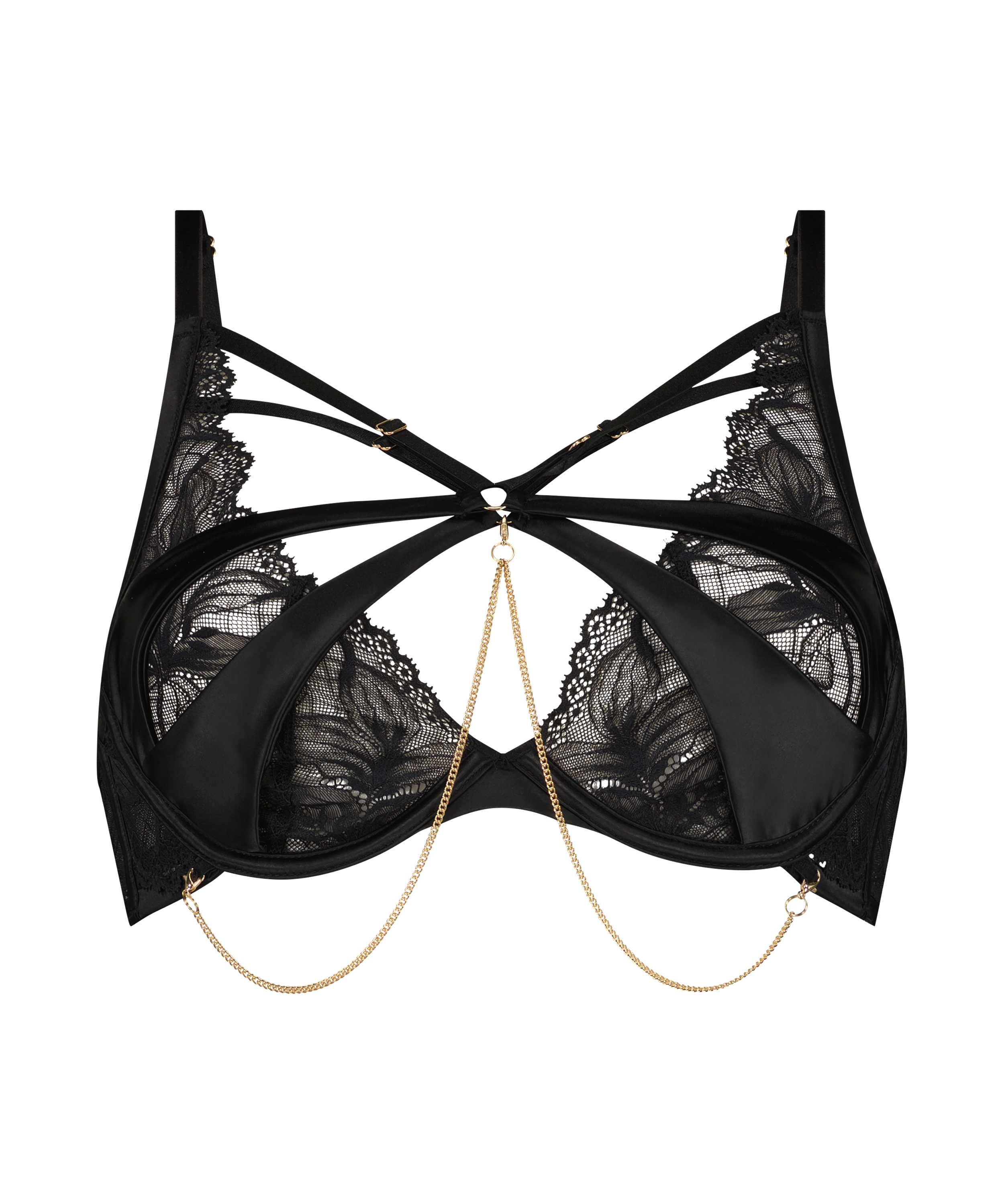 Ten seksowny biustonosz jest wyjątkowo piękny! Ma regulowane ramiączka i miseczki z fiszbinami dla zapewnienia dodatkowej wygody. Koronka z przodu i odpinany złoty łańcuszek nadają biustonoszowi seksowny wygląd. Połącz z dopasowanymi majtkami. Część kolekcji Private.
