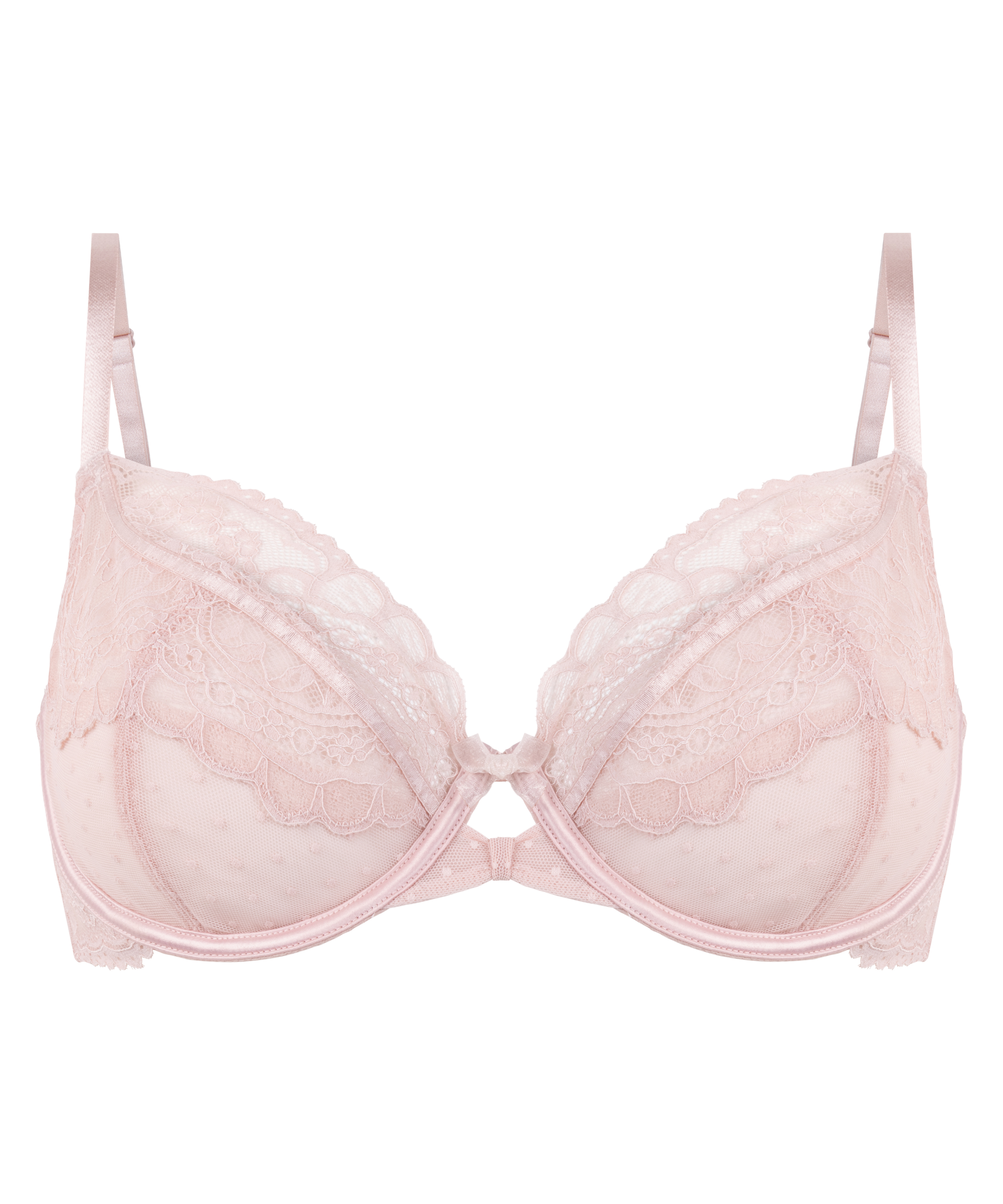 Dodaj odrobinę kobiecości do swojej kolekcji bielizny dzięki temu biustonoszowi. Koronka na górze miseczek nadaje im romantycznego charakteru, a kropkowana siateczka na dole zapewnia zabawny kontrast. Dzięki wspierającym fiszbinom i eleganckiej kokardce na środku ten biustonosz łączy w sobie wygodę i styl.