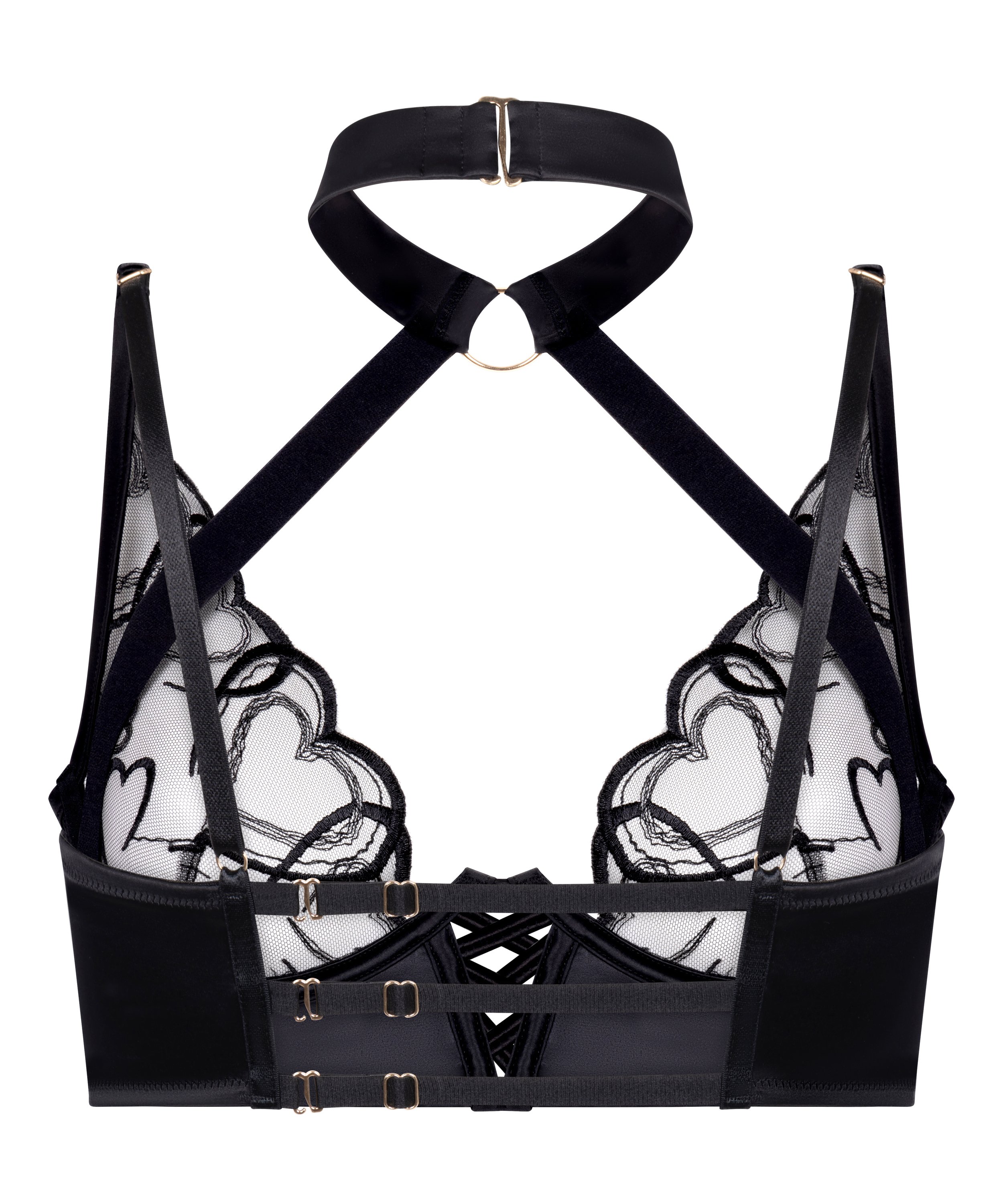 Ten biustonosz na fiszbinach łączy w sobie strukturę i styl dzięki miękkim koronkowym miseczkom oraz wyjątkowemu zapięciu na krzyż na plecach. Bez wypełnienia, aby dopasować się do kształtu ciała, zapewnia delikatne wsparcie, a jednocześnie jest lekki i kobiecy. Regulowane paski gwarantują wygodę, a detale z koronki w kształcie serduszek dodają romantycznego charakteru. Odważny, a zarazem delikatny element uzupełniający Twój wymarzony komplet bielizny.