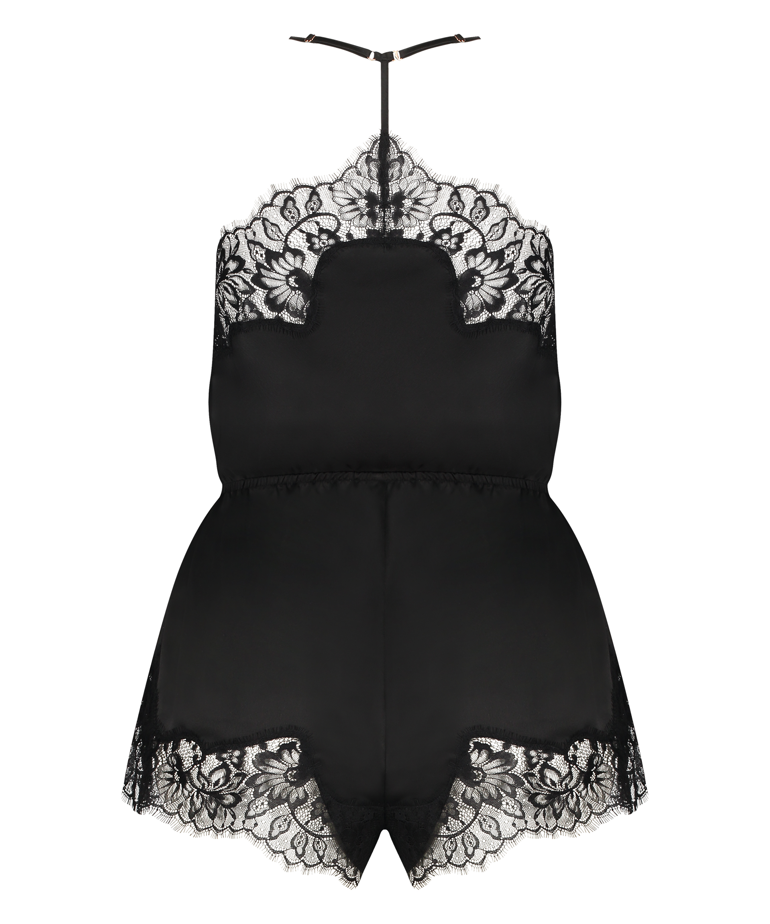 Zrób wrażenie w tym fantastycznym onesie! Niezwykle piękne onesie jest wykonane z satynowego materiału i ma mnóstwo koronkowych detali na całej powierzchni. Elastyczny pas zapewnia bardzo wygodne dopasowanie. Połącz z dopasowanymi elementami. Część naszej kolekcji Noir.
