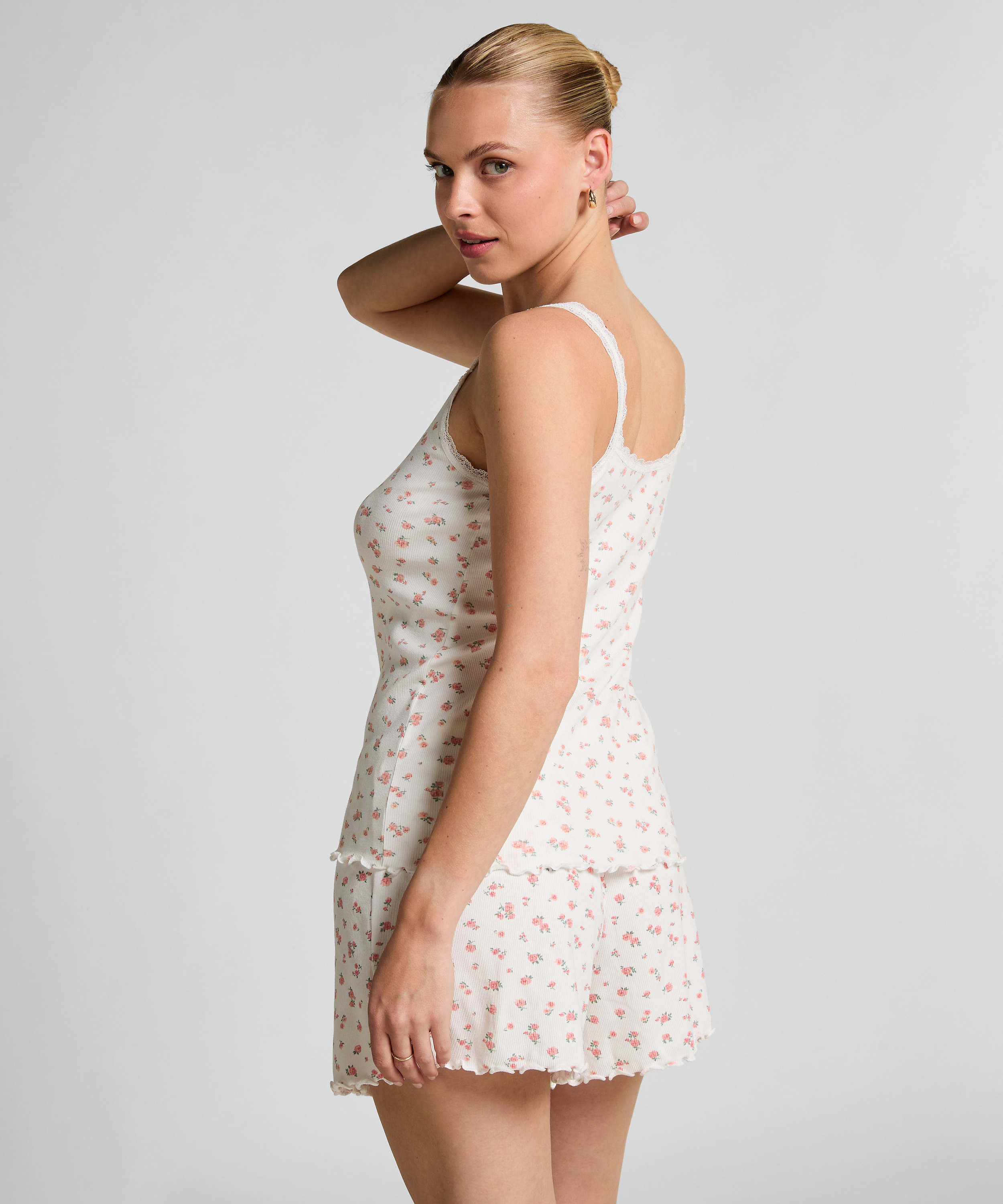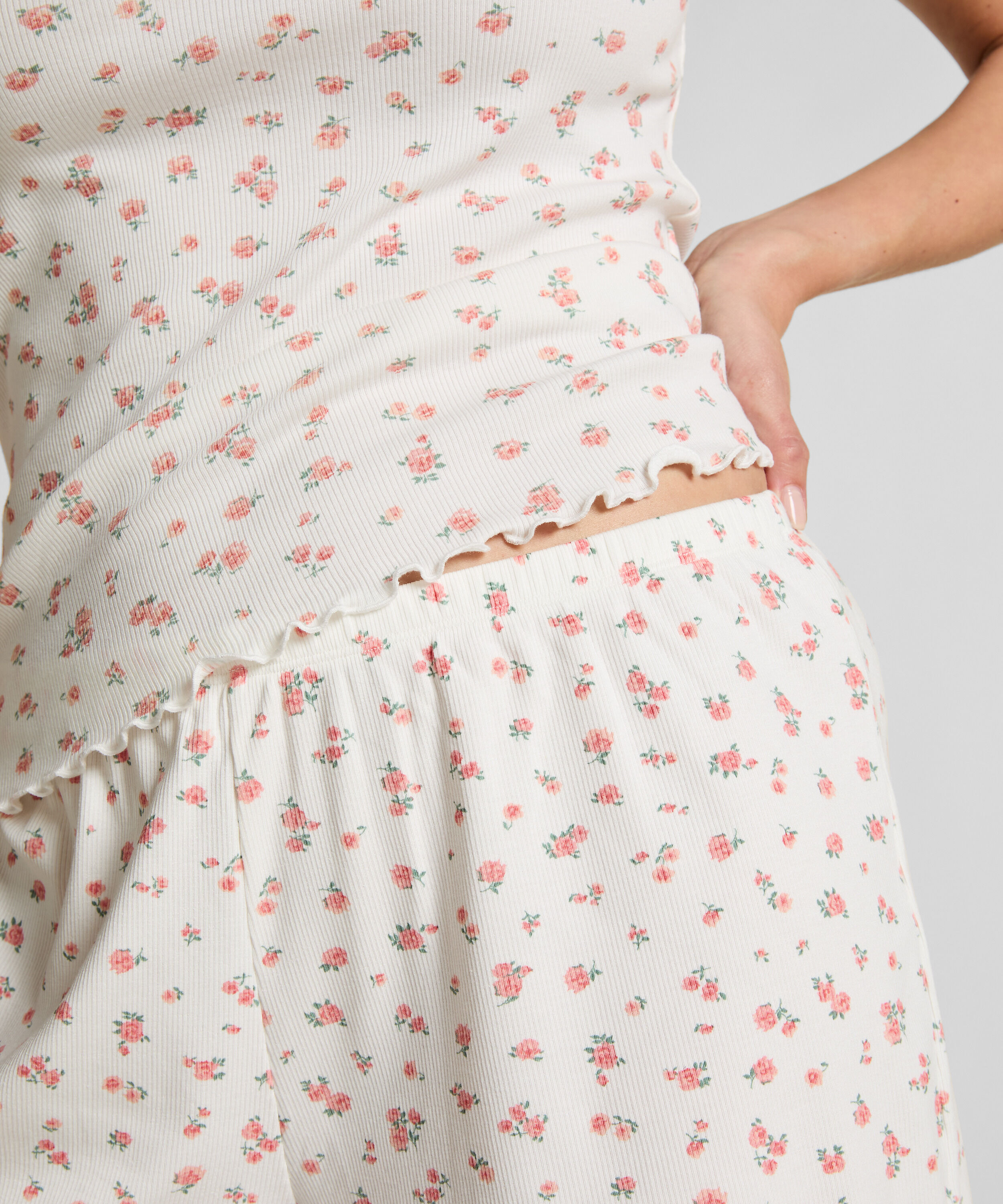 Delikatne detale na wymarzone dni i noce! Ta bezrękawa, prążkowana koszulka na ramiączkach i dekolcie wykończona jest koronką, ma śliczną kokardkę z przodu i miękkie falbanki u dołu — to Twój wybór, jeśli chcesz dodać sobie odrobiny uroku i wygody.