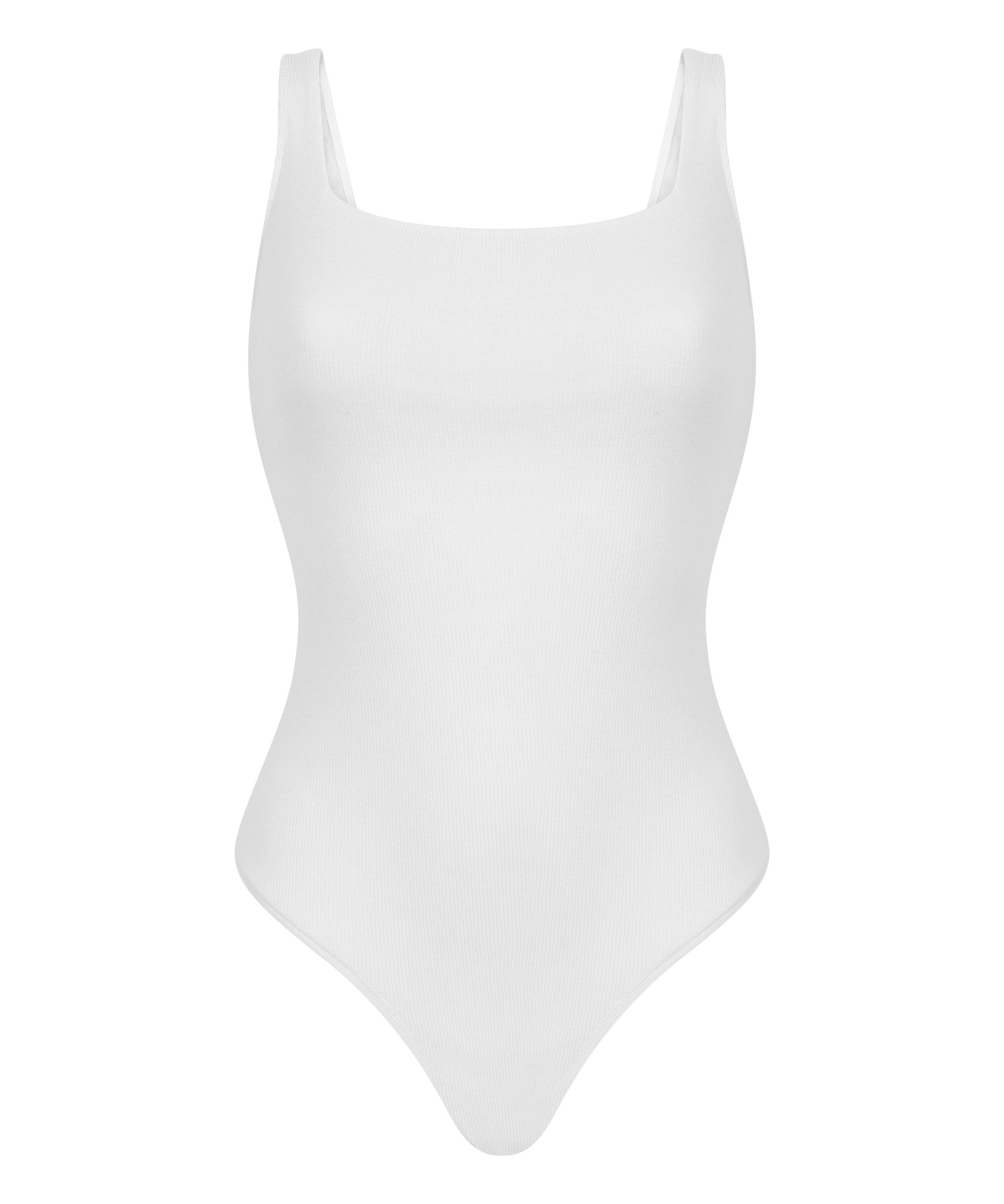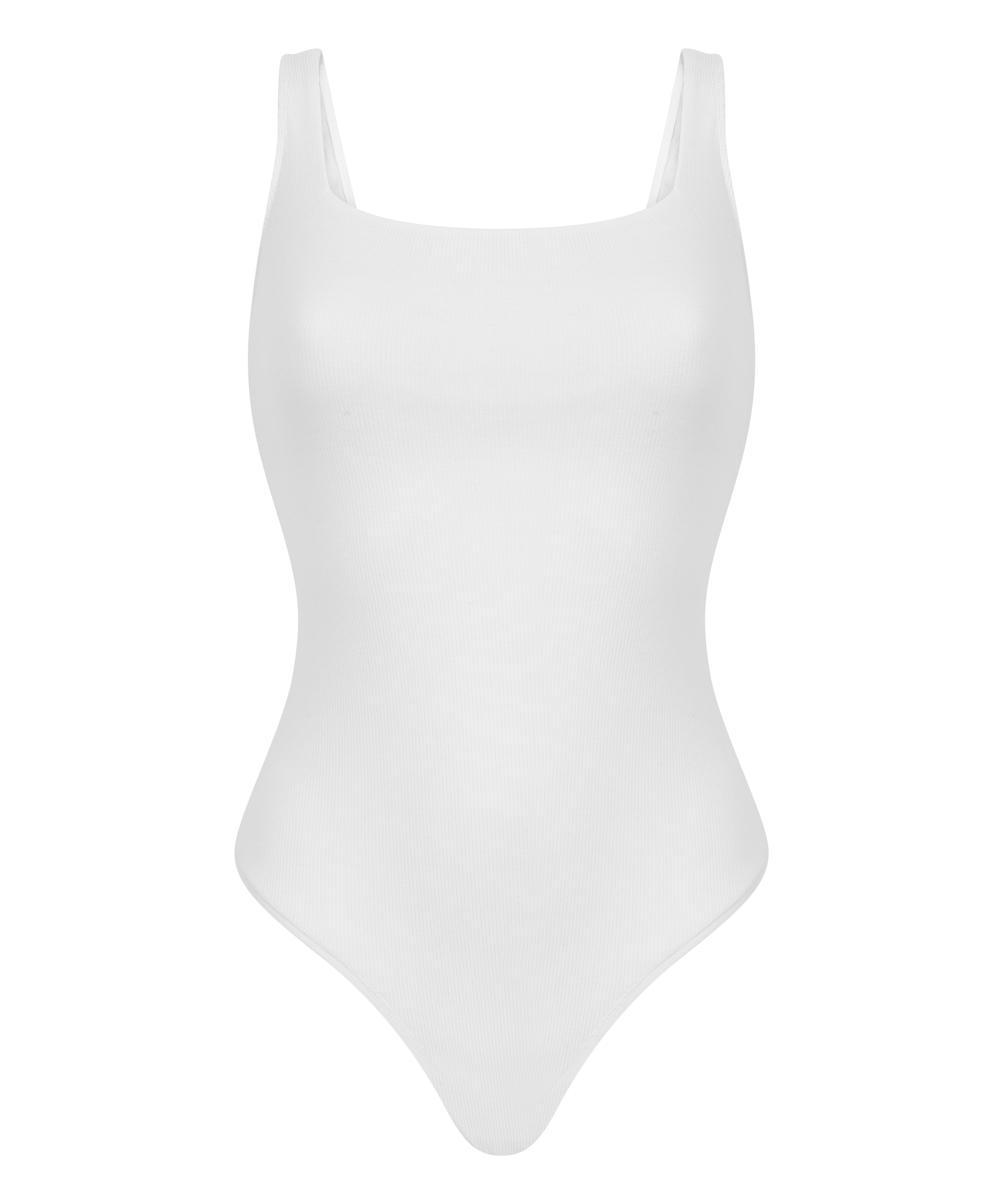 Bawełniane body wykonane z miękkiego, prążkowanego materiału z szerokimi ramiączkami dla większego wsparcia i dodatkową warstwą materiału w okolicy biustu. Tył ma szeroki, wycięty w kształcie litery V tył i dół w stylu stringów.