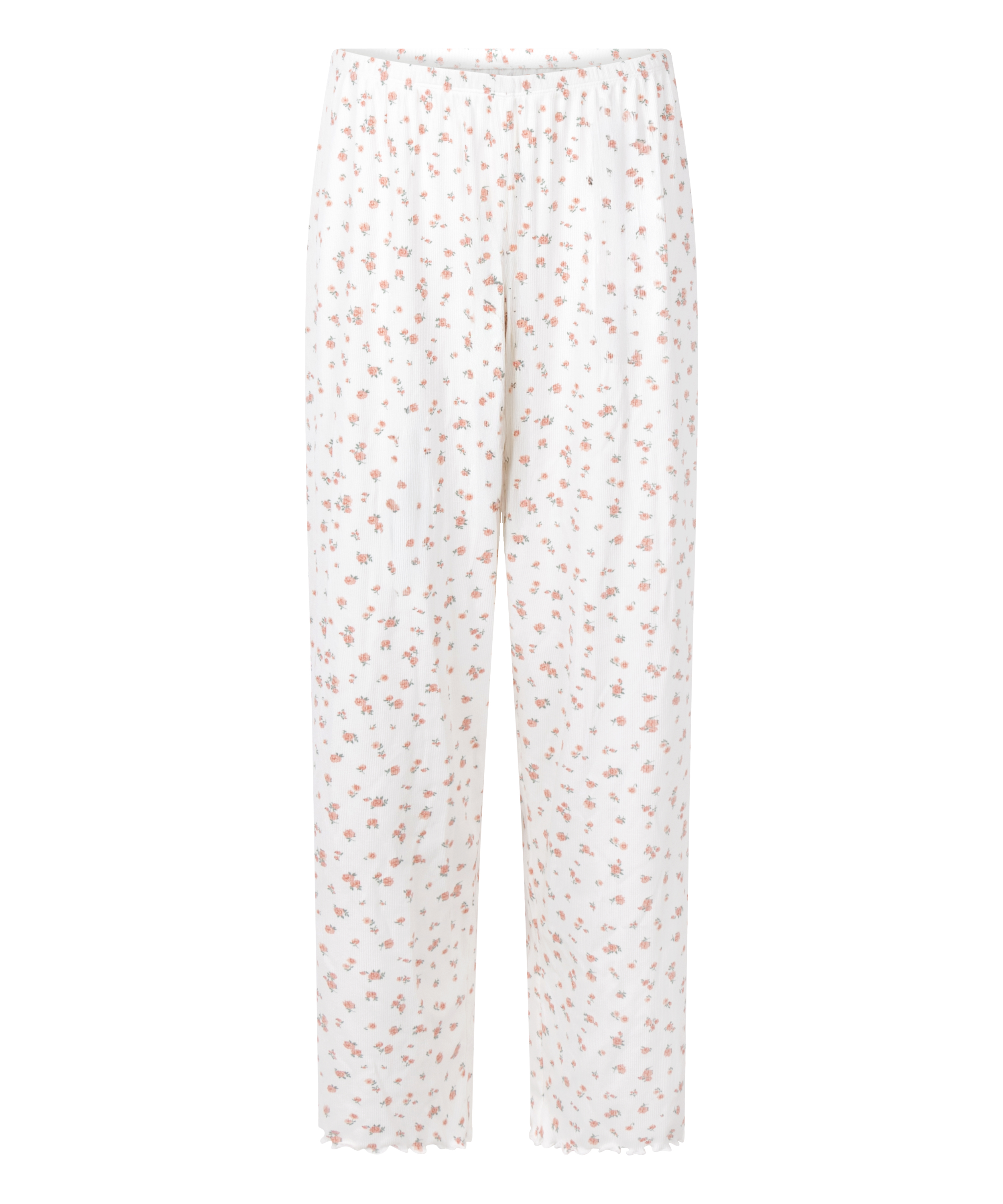 Przytulny komfort z zalotnym wykończeniem! Prążkowane spodnie piżamowe mają elastyczną talię i delikatne falbany u dołu, dzięki czemu idealnie nadają się na relaksujące wieczory i spokojne noce.